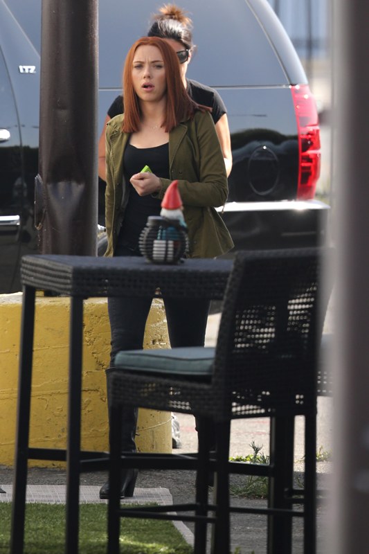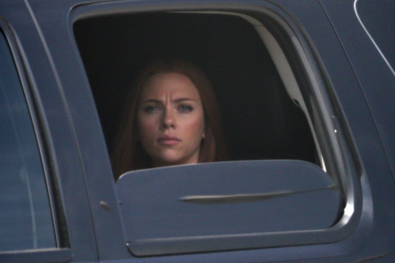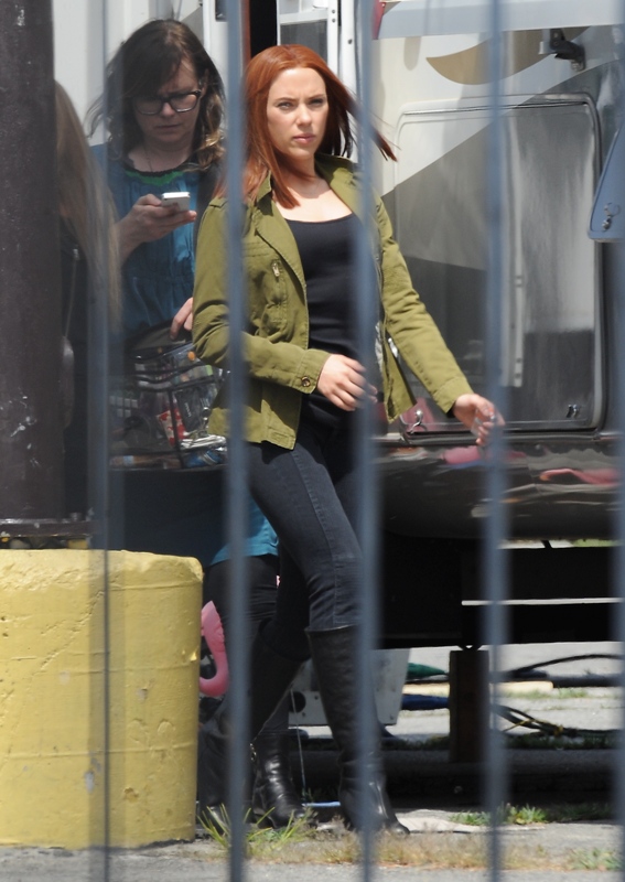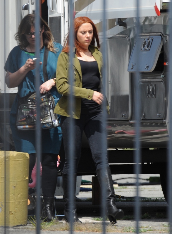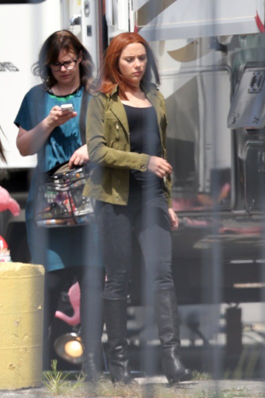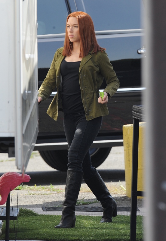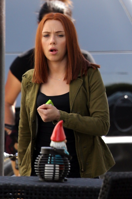 Here’s Scarlett Johansson on the set of Captain American: The Winter Soldier yesterday in LA. This will be the third time she plays Natasha Romanov, Black Widow. As Sarah wrote earlier this month, “The Winter Soldier is all tangled up in the Black Widow’s backstory” and while, unlike Sarah, I don’t speak nerd, I’m guessing it has something to do with all that “red in my ledger” she kept going on about in The Avengers.