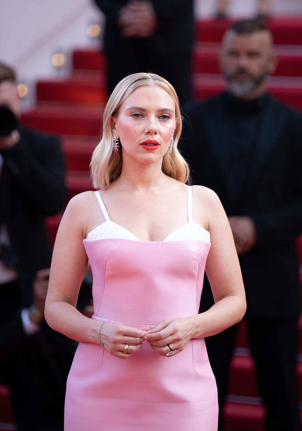 Scarlett is wearing custom Prada at the premiere. I don’t love it, because I never love when Prada does pink (see Anne Hathaway at the Oscars) but if there’s anyone who can pull off a look like this, it’s her.