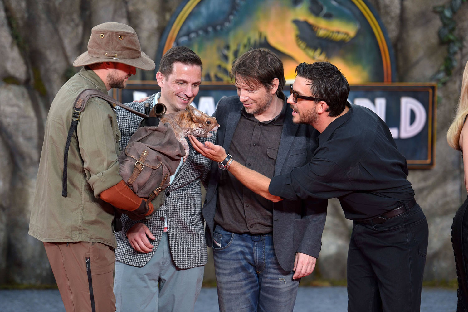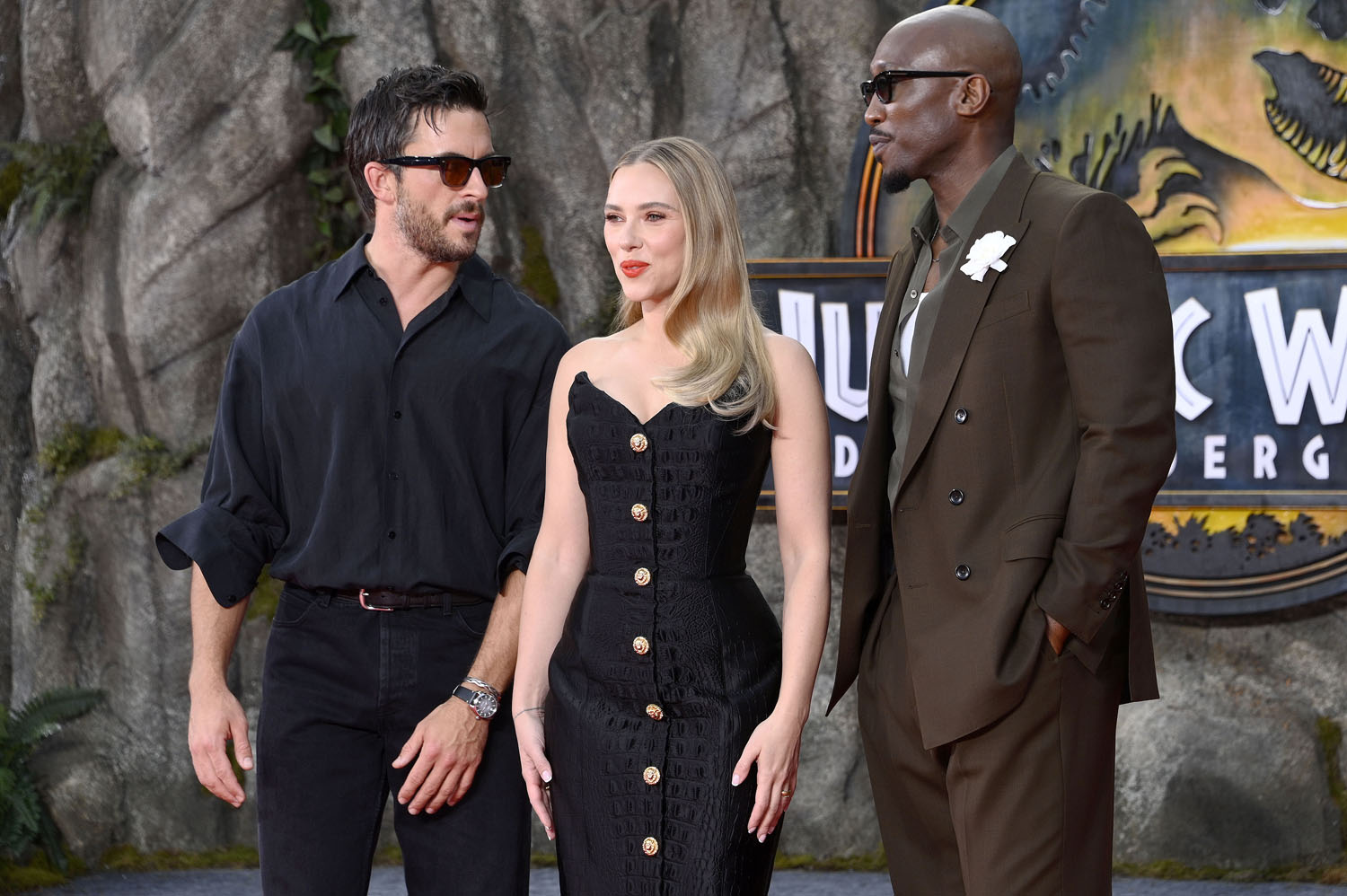 Sarah posted yesterday about Scarlett Johansson and Jonathan Bailey’s “slutty little sunglasses” at the Jurassic World Rebirth premiere in London and from there they were off to Germany which is where we find Mahershala Ali in a great looking brown suit and Jonathan in another pair of horny shades but a rather ordinary outfit although that in itself is a flex because even when the clothes aren’t remarkable, the sex appeal of this man, my GOD.