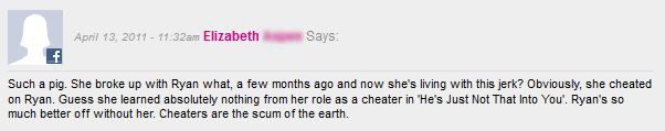 Such a pig. She broke up with Ryan what, a few months ago and now she's living with this jerk? Obviously, she cheated on Ryan. Guess she learned absolutely nothing from her role as a cheater in 'He's Just Not That Into You'. Ryan's so much better off without her. Cheaters are the scum of the earth.