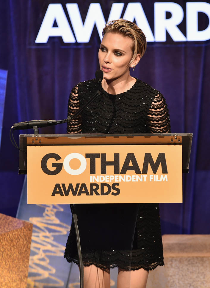 Scarlett was at the Gotham Awards last night with her husband. The more I see her hair, the more I love it. And the eye makeup is perfect.