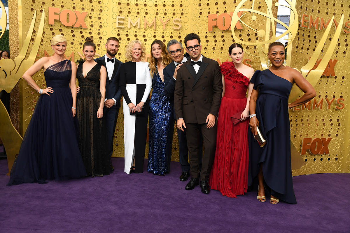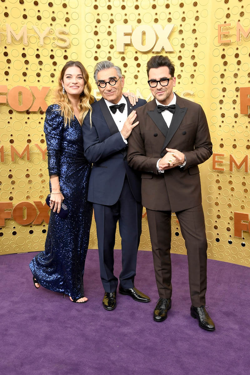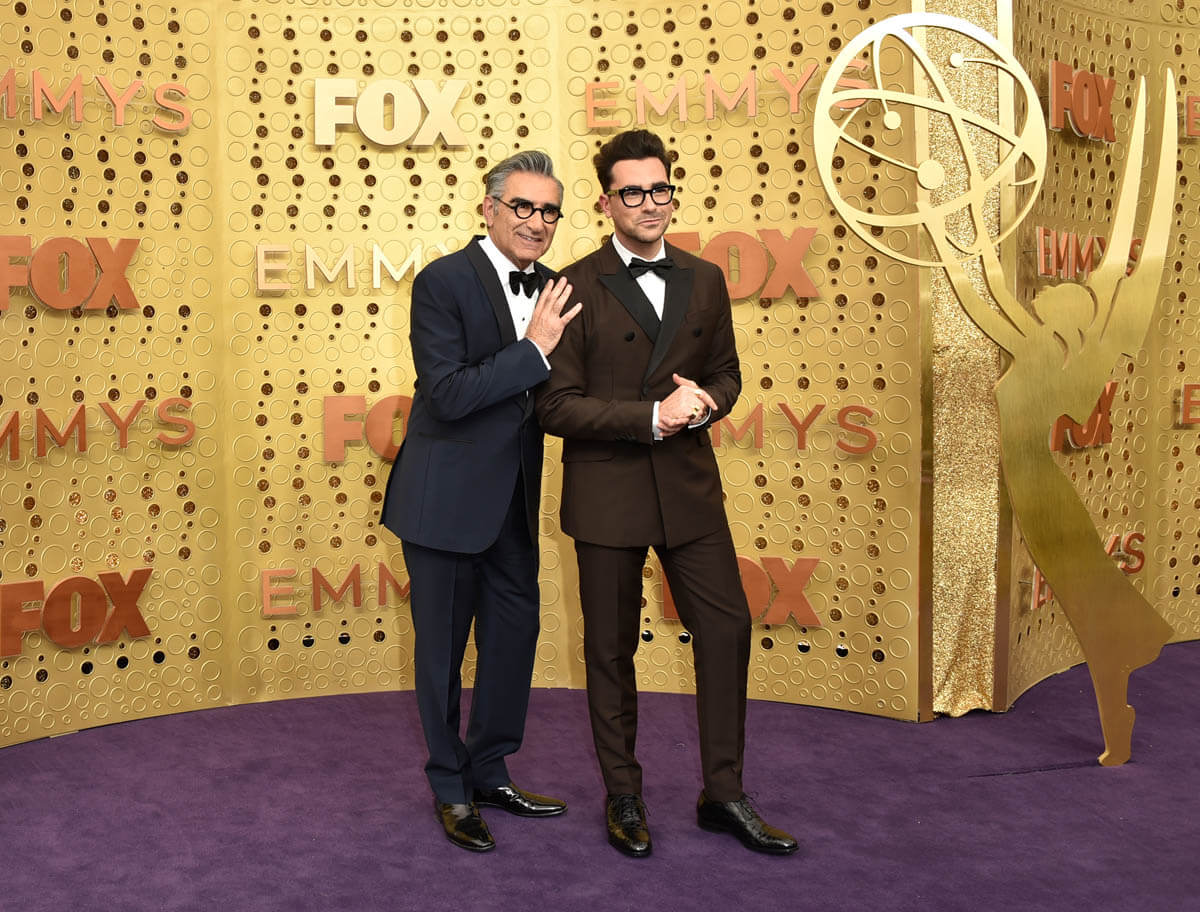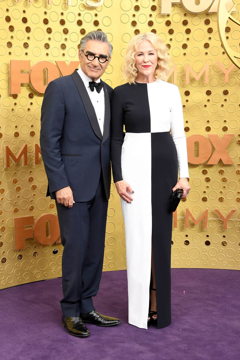 Also authentic – everyone who expressed joy at the ‘Moira-Rose-ness’ of Catherine O’Hara’s black & white column dress, Dan’s Prada tux, and the colour story of their outfits en masse, as if David Rose would have it any other way.