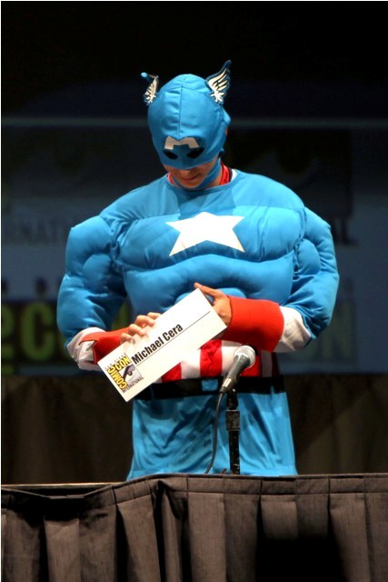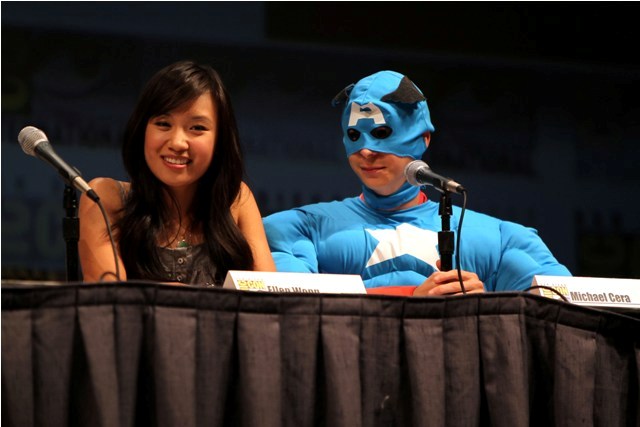 And they do. All of them rolled up to the Entertainment Weekly party together on Saturday night. Yes, and Chris Evans too. He couldn’t attend the panel because Captain America production wouldn’t give him the day. Soon as he was done with his Marvel obligations though he hooked up right away with his Pilgrim crew, instead of playing the big star card, and they were all inseparable all for one all night. I remember looking back at one point and seeing Evans standing next to Cera throwing his head back roaring about something Cera had just said. It’s very, very cute.