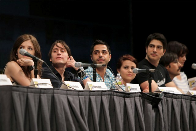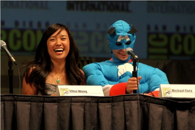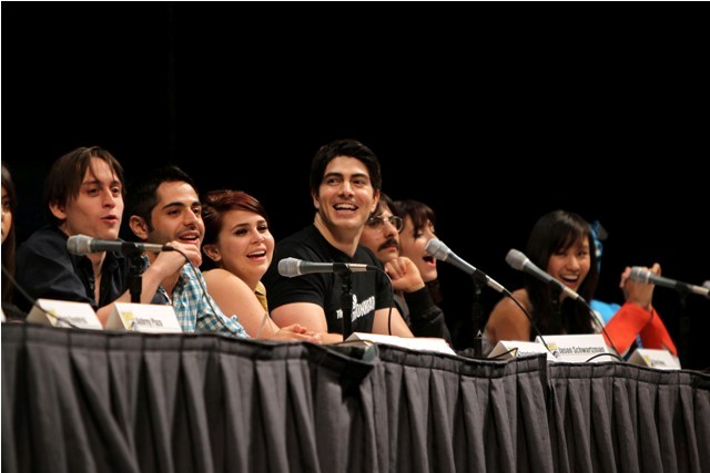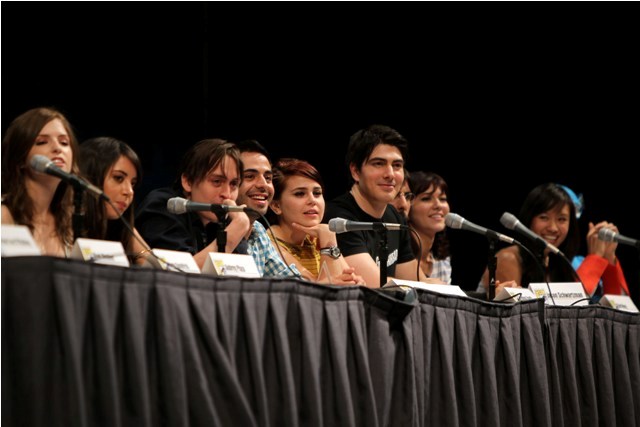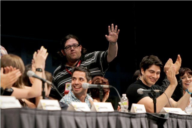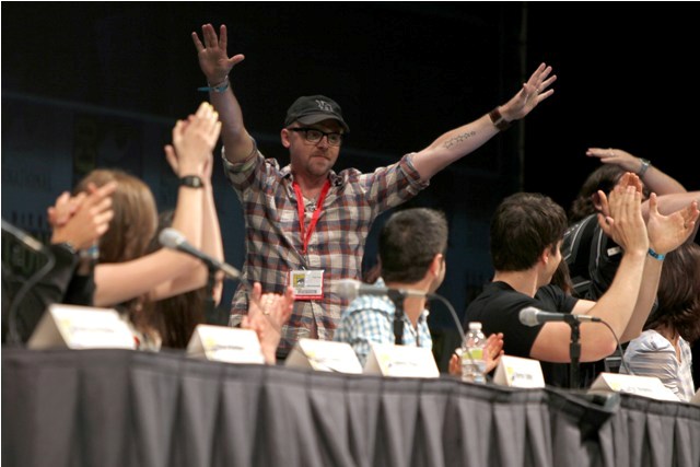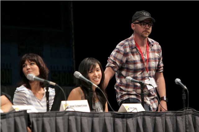 The Scott Pilgrim panel took place on Thursday. It’s a big cast. After all, Scott Pilgrim loves Ramona. But he can’t be with Ramona until he defeats all her exes. All 7 of them. And Scott’s in a band. And he has a sister. So many characters, so many actors, and almost all of them were present, all of them engaged, enthusiastic, all kind of in love with each other, and deeply in love with their movie. And Simon Pegg and Nick Frost too – they crashed the panel and you get the sense that these people are not just colleagues but mates, truly mates, who believe in the work and each other and can’t wait to share it. There was a real sense of camaraderie talking to them afterwards, they couldn’t stop, like, hugging each other, and jumping in on each other’s interviews, and Mae Whitman actually went so far as to tell me that Chris Evans is “brilliant” (huh?), and they all genuinely seem to know each other, the way friends know each other and hang out.