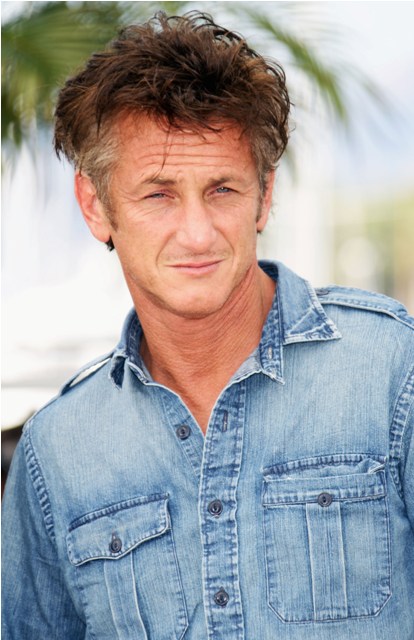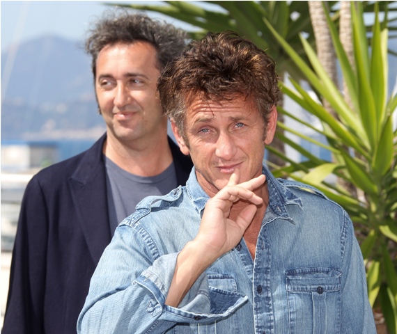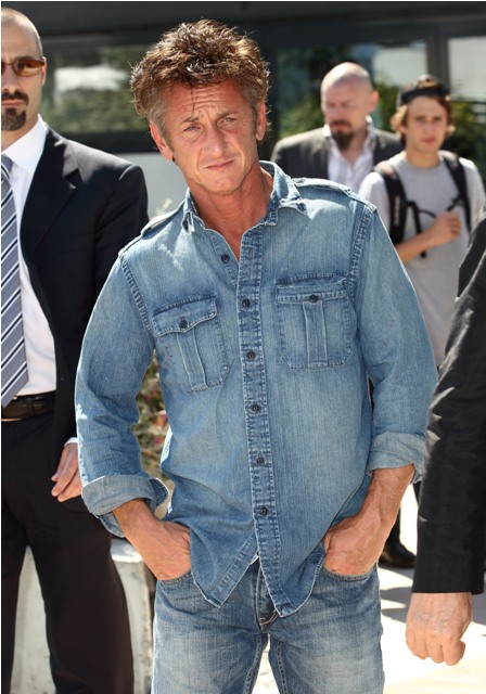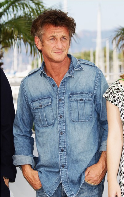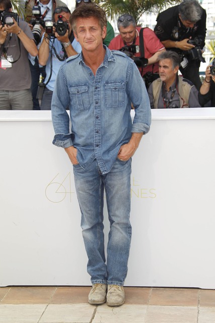 Sean Penn is killing it in Cannes today. Check him out working denim on denim, posing with some hip-jutting attitude at the photo call for This Must Be The Place. He plays Cheyenne, an aging goth rocker looking for the Nazi who tortured his dad. I want you to watch this clip before reading the rest.