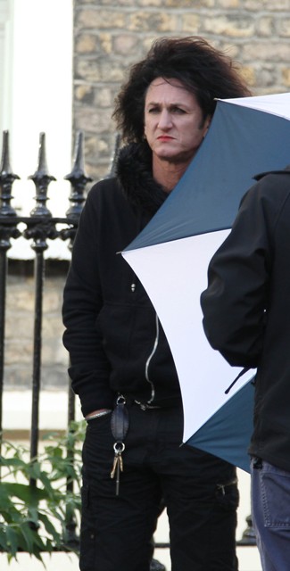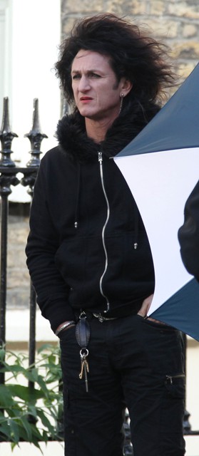 Seen in Dublin today on the set of his lastest This Must Be The Place playing a rock star in pursuit of the Nazi who f-cked around with his dad in a concentration camp. Well, he’s not Adam Sandler, is he? His co-star in the movie – Eve Hewson, sound familiar? Eve’s dad is some dude called Bono, perhaps part inspiration for Penn’s performance.