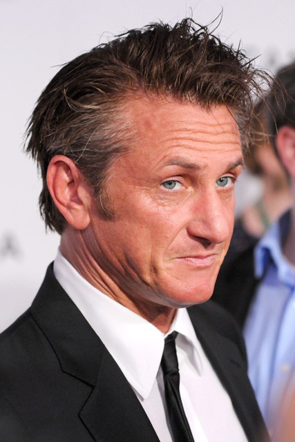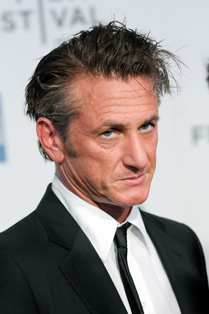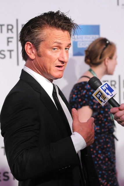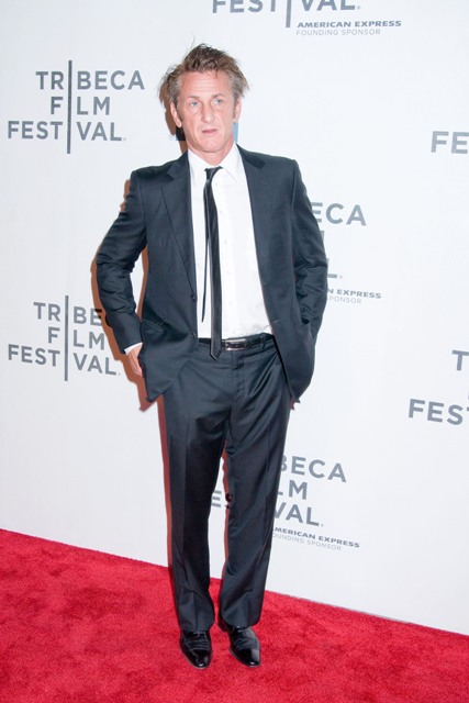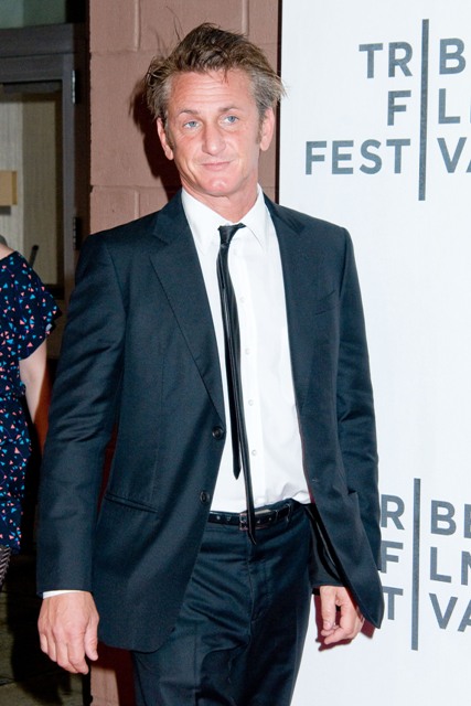 Sean Penn showed up at the premiere of Love Hate Love at the Tribeca Film Festival last night in a skinny tie with some gel in his hair like he was trying to work a little Robert Pattinson/Edward Cullen into his life. Maybe Scarjo likes it that way. Running her hands through it when it’s all sticky, after she removes her foot off of his balls. As he blows cigarette smoke into her face while he’s sharing his greatest acting tips.