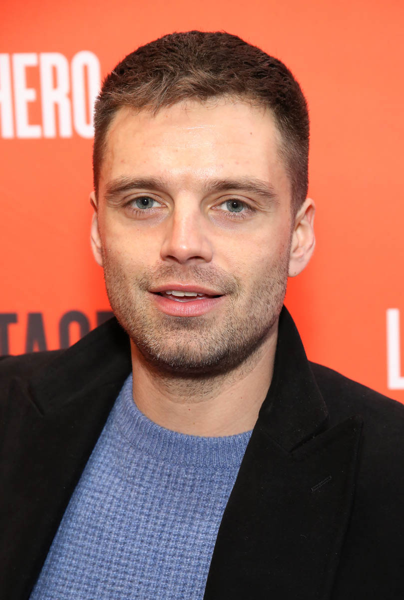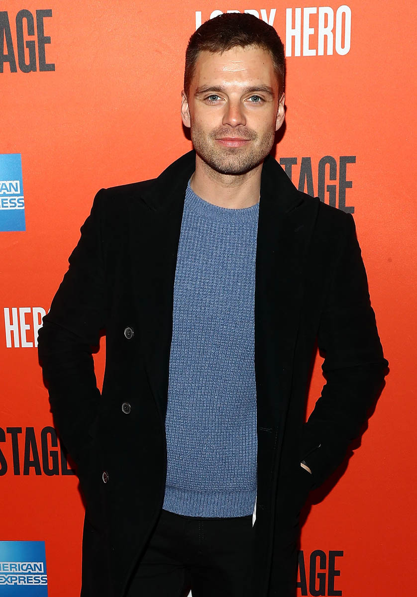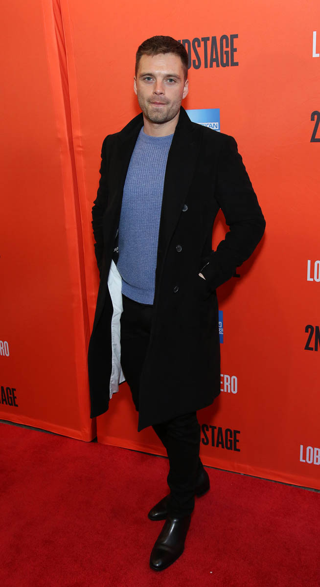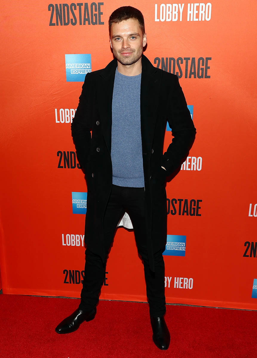Here’s Sebastian on Monday at the opening night of Lobby Hero starring his co-Avenger Chris Evans who has decided to go ugly for Broadway. So Chris’s hotness stock has dropped which only increases Sebastian’s. Check them out, side by side.