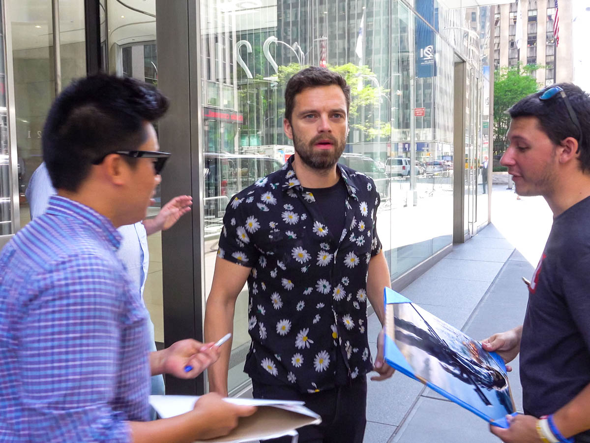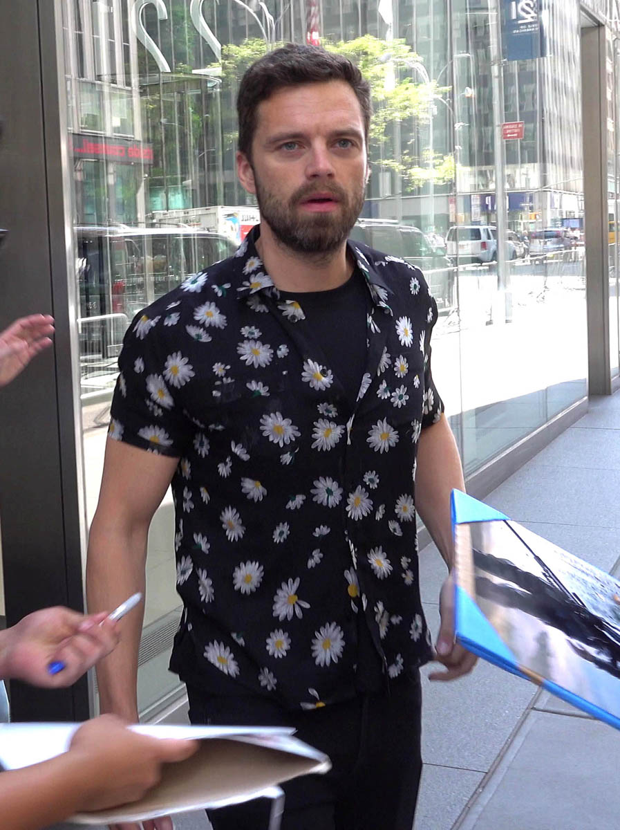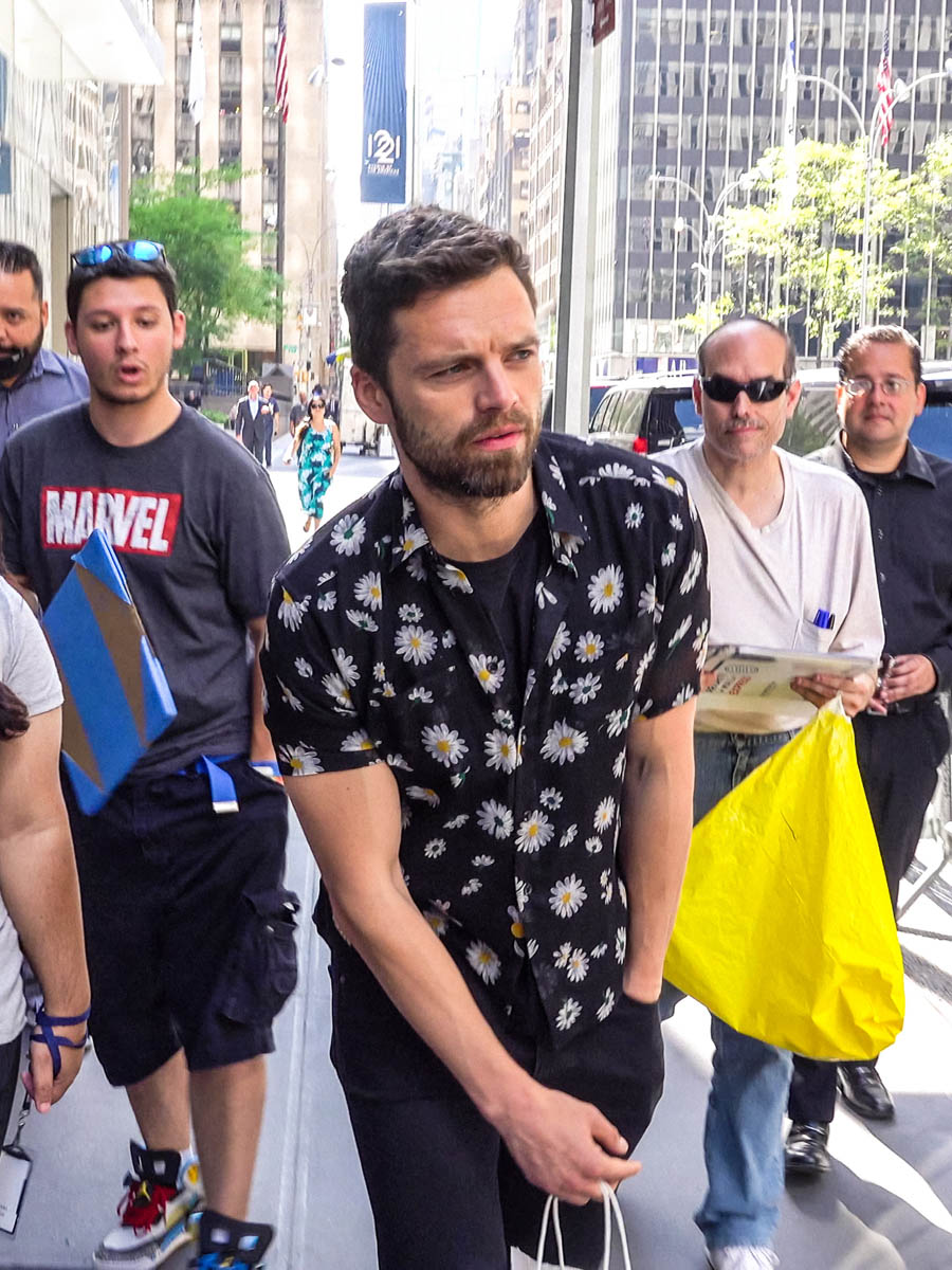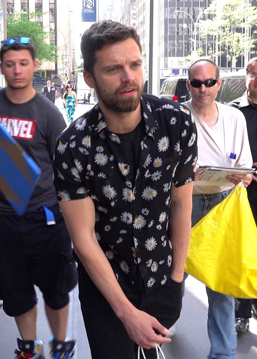 Posting about Sebastian Stan has become unexpectedly contentious here on this blog. Sarah saw him first and Kathleen saw him later and they end up yelling at each other on Twitter about it and then I have to pull them apart. So I’m doing this one – Sebastian Stan in New York yesterday promoting the DVD release of Avengers: Infinity War. As part of the campaign, they’ve been putting out bonus details about the movie, like how the Russo Brothers almost had a Sherlock Holmes joke written into a scene between Tony Stark and Doctor Strange, and how Winston Duke improvised his Jabari war chants. They’re also posting more clips from the movie online. Like the reunion between Captain America and Bucky Barnes, aka “Stucky”, for the stans who want Steve Rogers and Bucky Barnes to become superhero lovers.