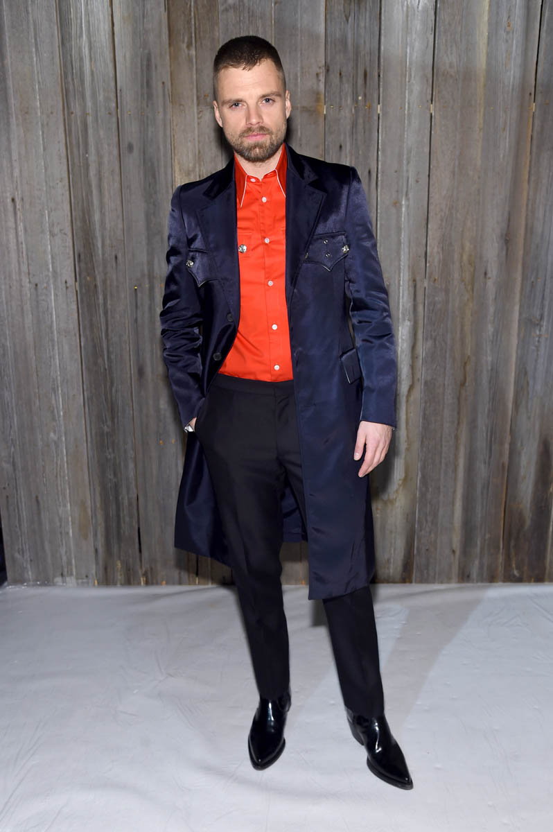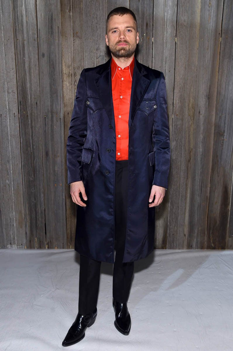 Bucky Barnes has never done it for me but now I think it may have just been his bad hair (Lainey once nicknamed him Bucky With The Bad Hair.) This, however, is a GOOD look for him. I also love his Calvin Klein fashion week ensemble. The navy trench is a great colour and length. The red shirt is a nice touch. Aside from everyone in the cast of Black Panther, this is the best menswear look I’ve seen all season. Sebastian looked great at the Tom Ford show last week and again at Hugo Boss a few days after that. I also never would have bet that Sebastian Stan would be one of the best dressed men of 2018 but here we are.