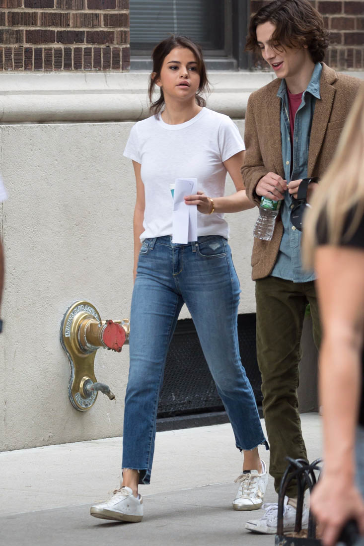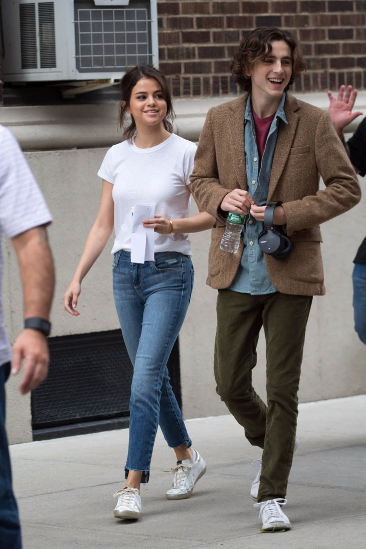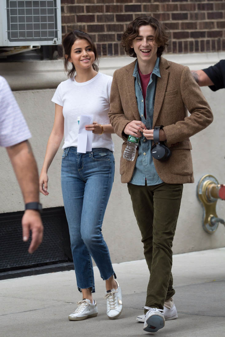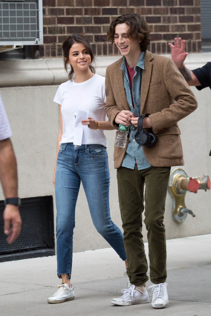 Here is Selena on set of her new Woody Allen movie today with co-star Timothee Chalemet.