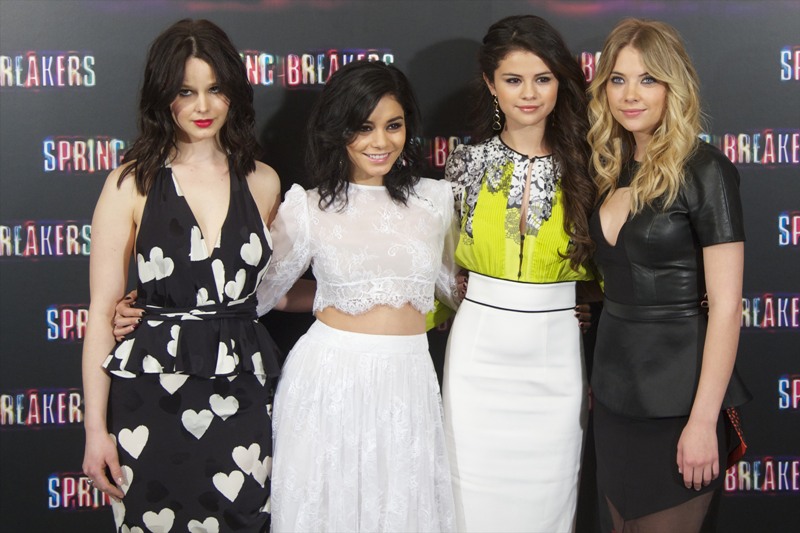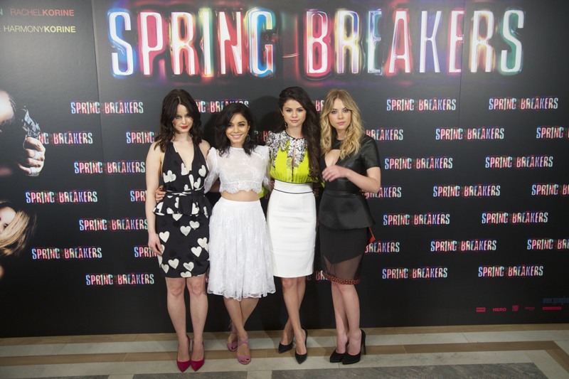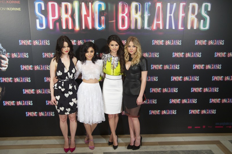 Selena Gomez, Vanessa Hudgens, Ashley Benson, and Rachel Korine have been promoting Spring Breakers all across Europe. Gomez, obviously, is the highest ranked player in the group. And you can tell by the styling. She’s been dressed in Gucci, Versace, several top end labels through this tour. Hudgens meanwhile is getting some second tier clothing. Certainly not major luxury labels (unless she buys it herself) but on the level of Naeem Khan (which she’s wearing here in Madrid) and maybe, like, Monique Lhuillier. The other two...you know. There’s a difference between wearing Topshop by choice, like the Emma Stones of the industry, and wearing it by necessity.