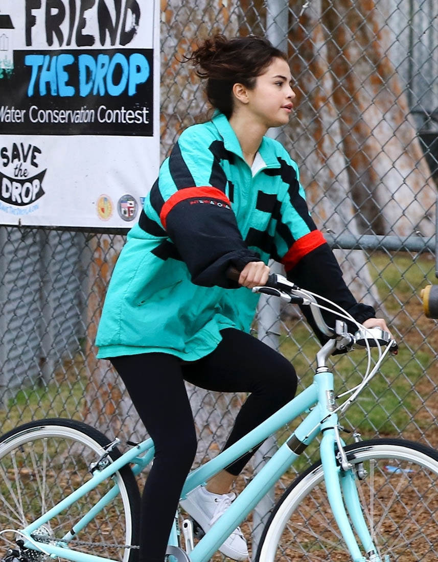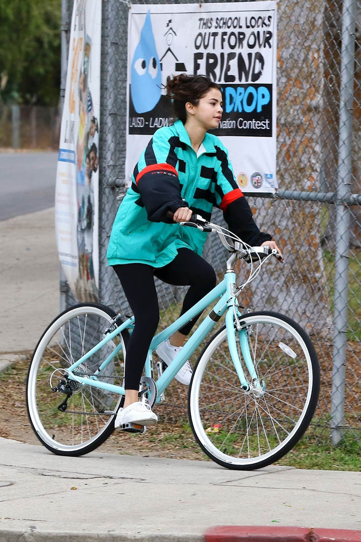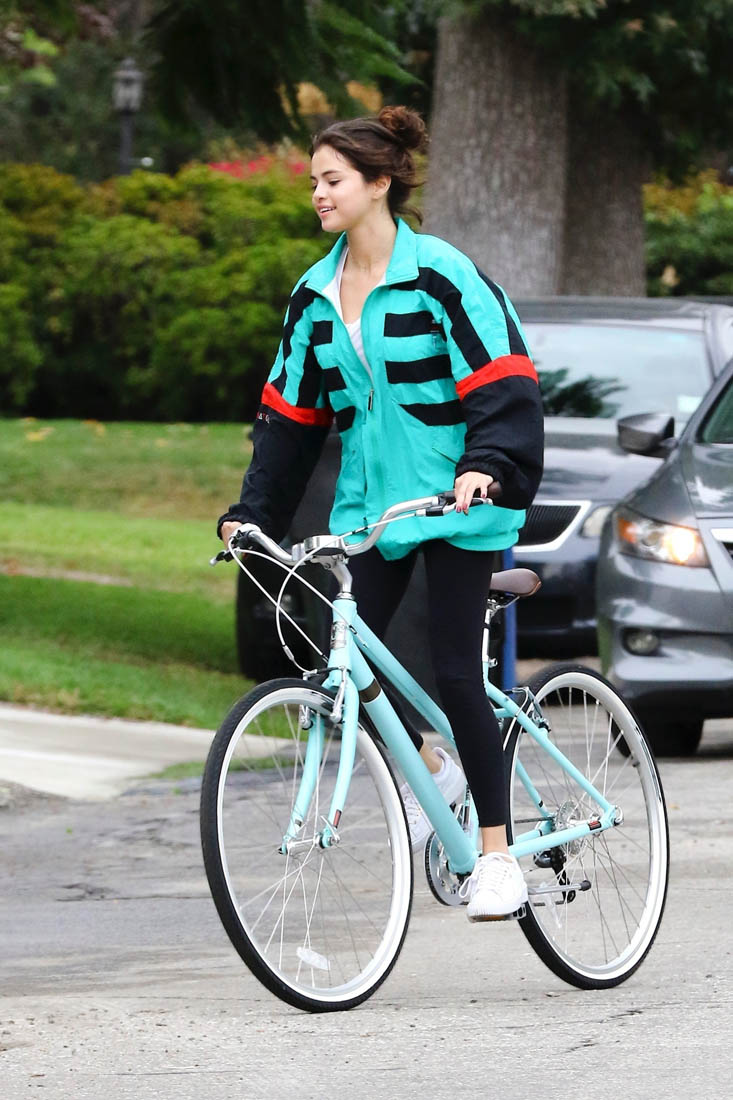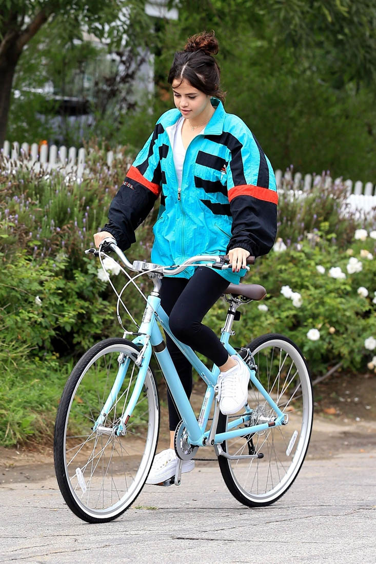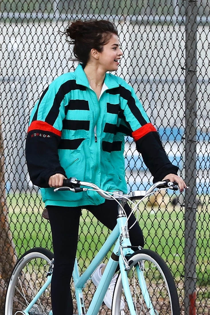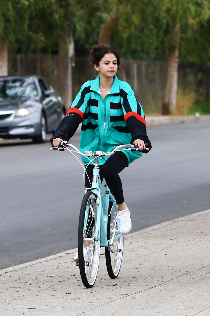 Here’s Selena on her bike yesterday looking not all that bothered by The Weeknd reestablishing his masculinity. She’s wearing his jacket though: