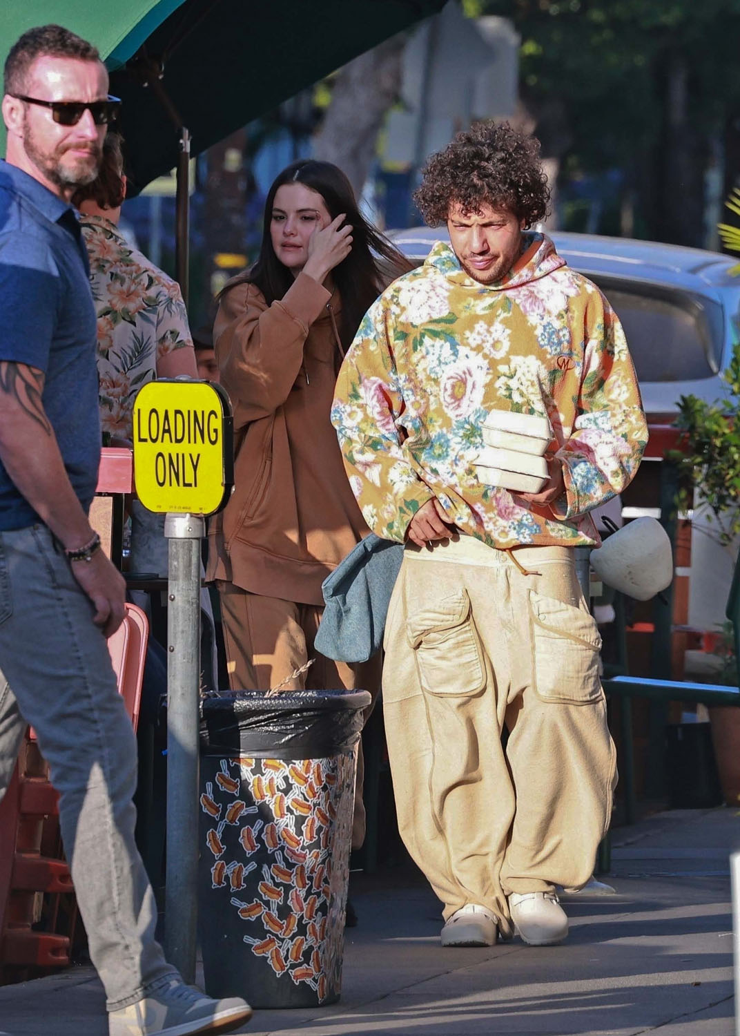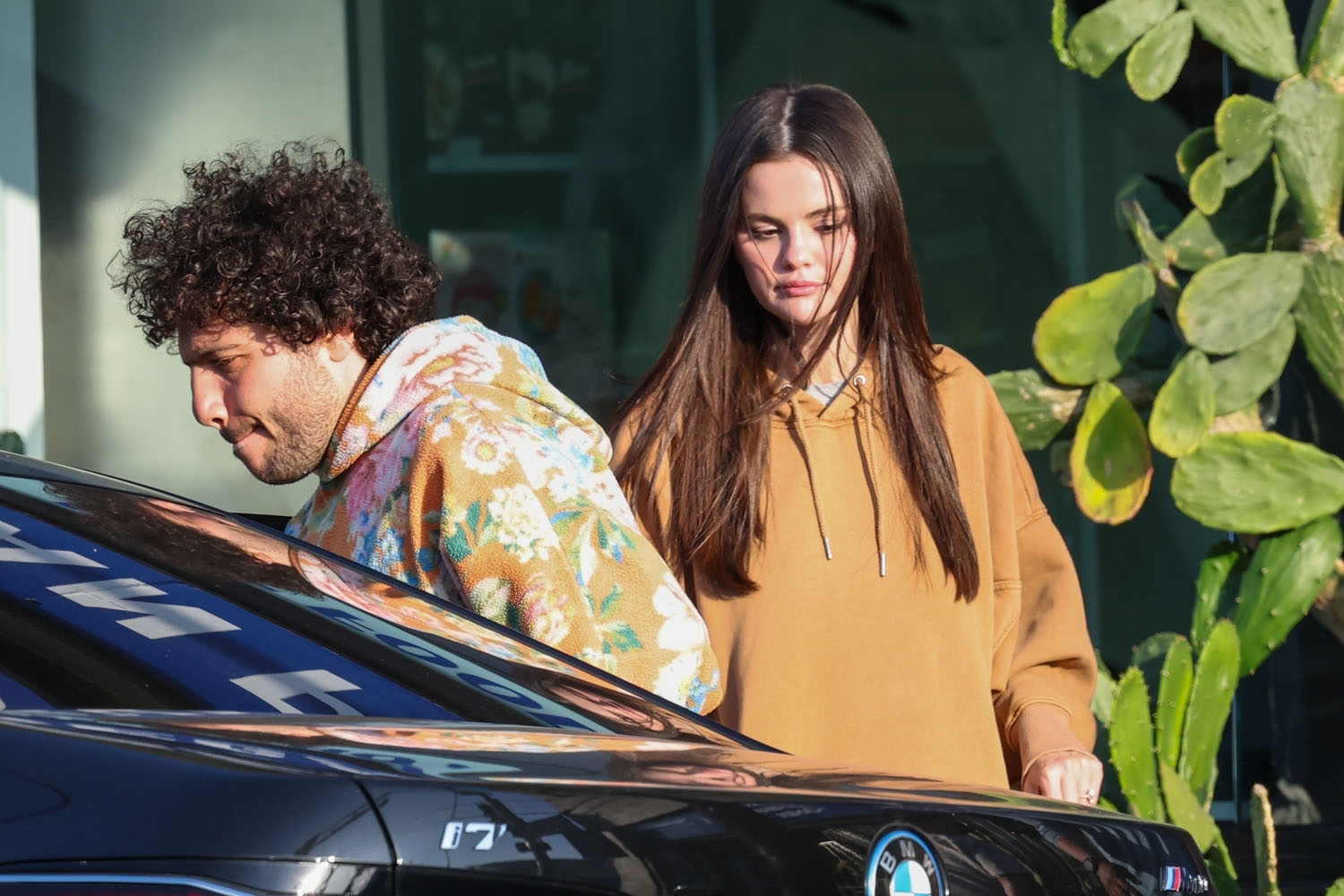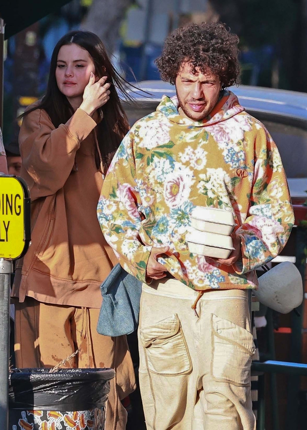 Anyway, Selena was papped with Benny Blanco, in cute coordinated sweatsuits, yesterday in LA, no bangs, no wolf. But there’s a hair change happening here too because it’s longer than we’re used to seeing and there is no way it grew that much in such a short time so she probably recently got some extensions put in. The question is whether or not they’re clipped-in or taped/weaved. We’ll find out, I guess, depending on how long we see her with her hair this length. Taping and weaving is usually for when you need them for a stretch.