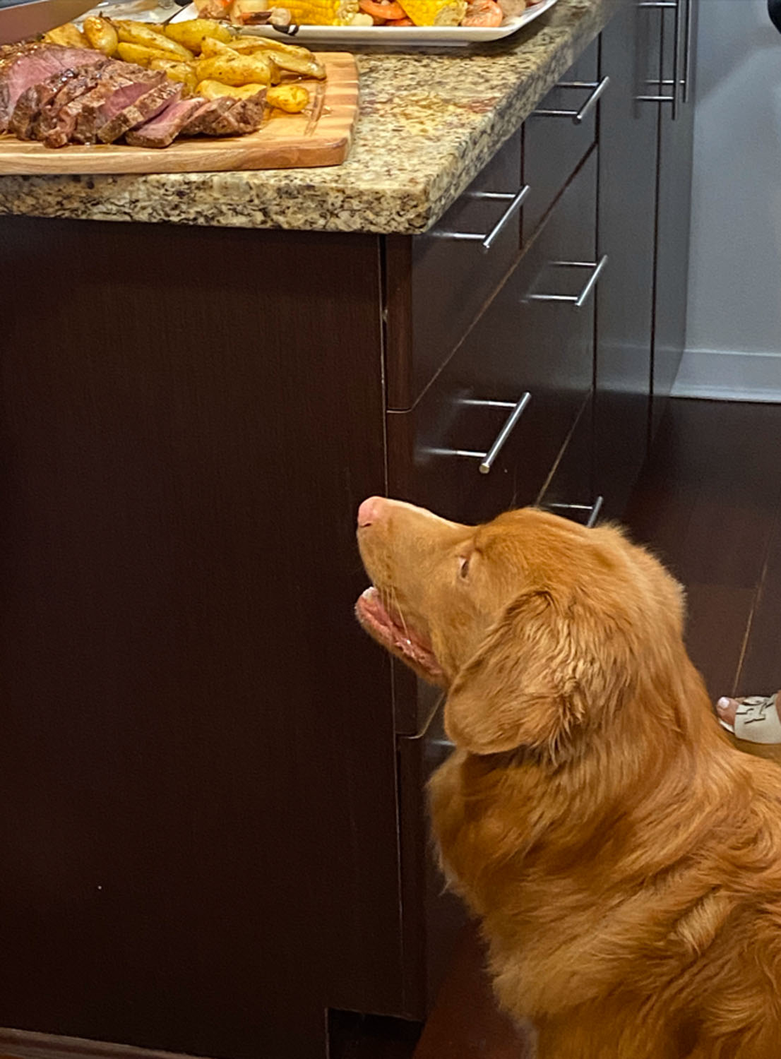 And, of course, Gus has expectations. When a good boy has done a good job, he thinks he deserves the meat and potatoes.