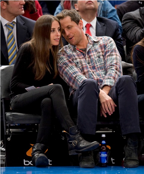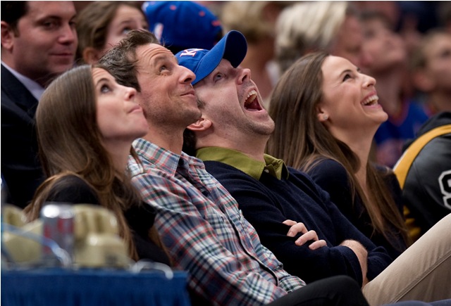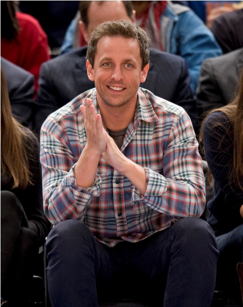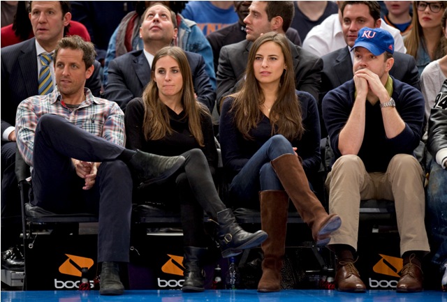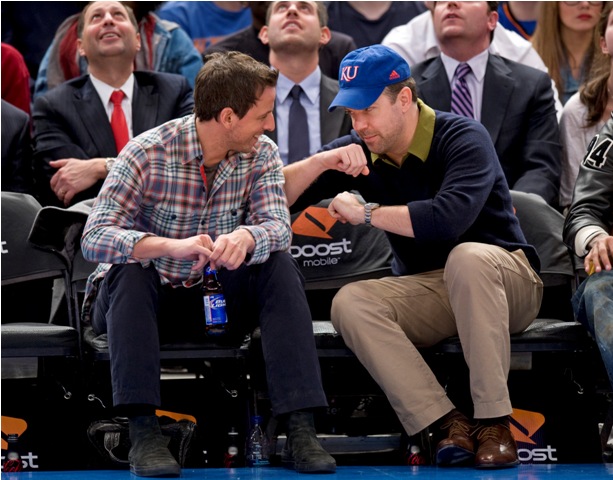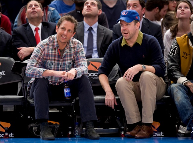 SNL’s Seth Meyers and Jason Sudeikis were courtside at the Knicks game last night. I like it that they spend time together outside of work. I don’t know, celebrity friends just make me happy, although I do wonder how tight they are. Because I’ve heard loose reports that Jason can be kinda dicky. Nothing super serious, but not exactly the sweetest guy out there, and not helped by his recent January Jones cock expansion. Is that still happening? I have no idea. January Jones is an afterthought for me. A boring one. Having said that however, let’s photo assumption these photos – is it a double date?