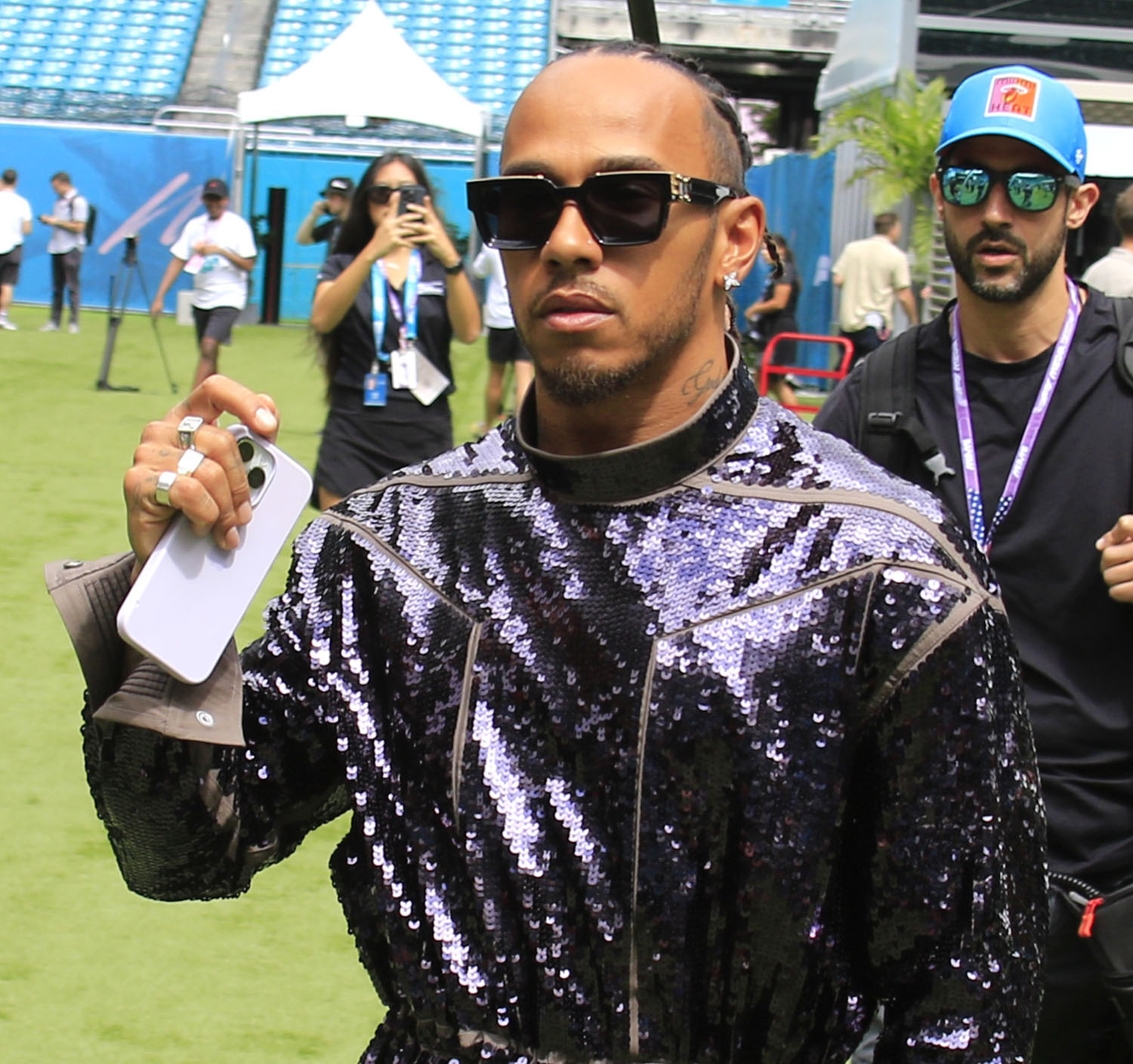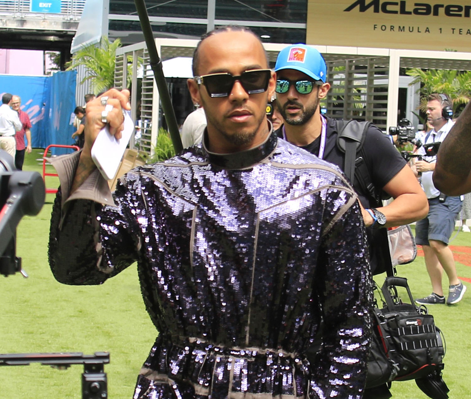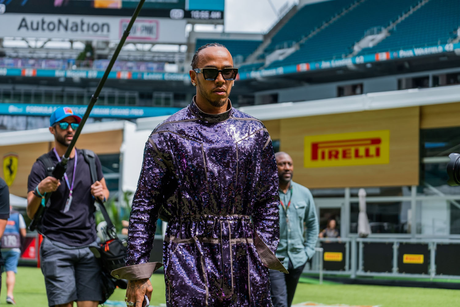 In other Lewis news, can I just go back a week because I didn’t have a chance last week to post about this look in Miami. And if you didn’t see it, you need to see it – the purple sequined jumpsuit.