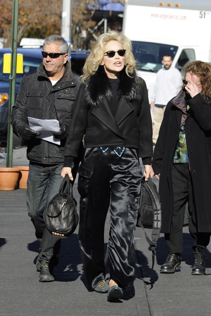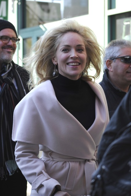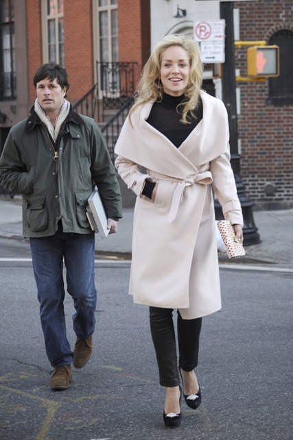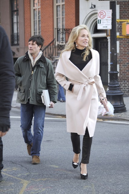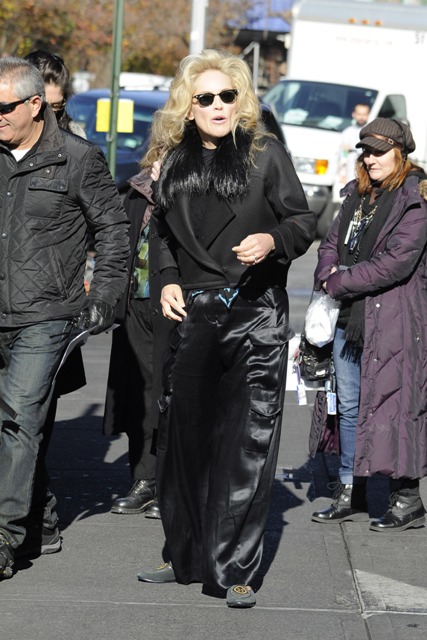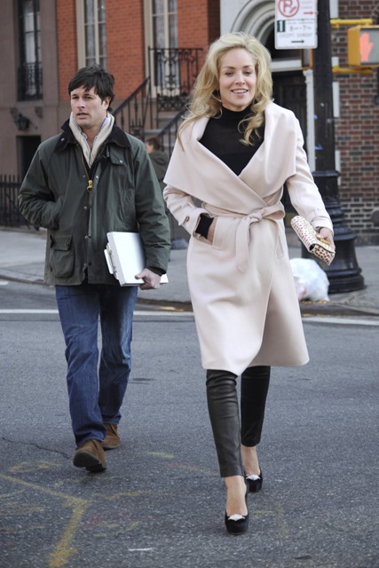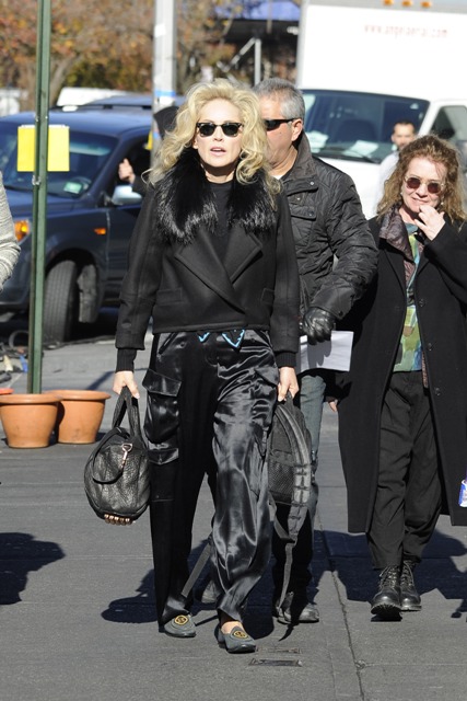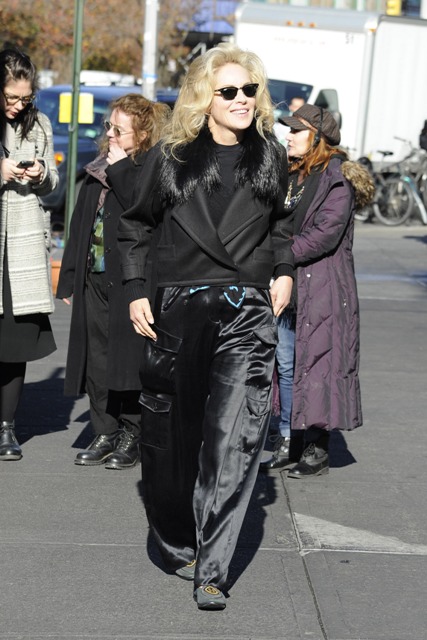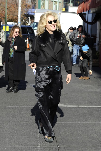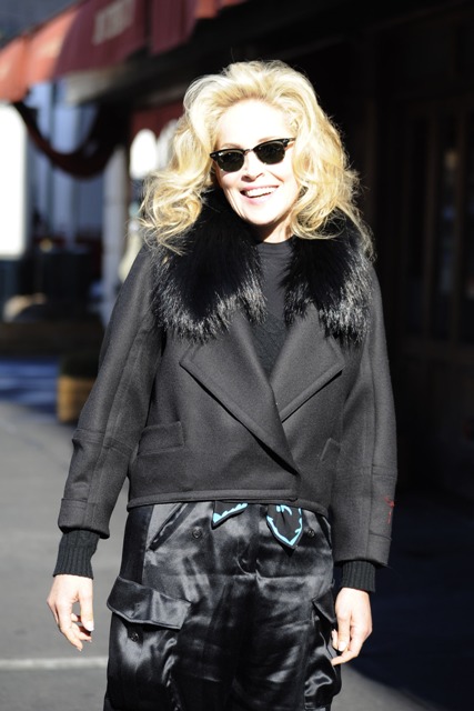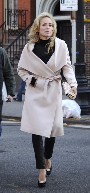 She knows she’s amazing in that white coat over leather pants. And she knows she’s even amazing in that black coat with her sateen pants, perhaps better now at 54 than she was at 45.
