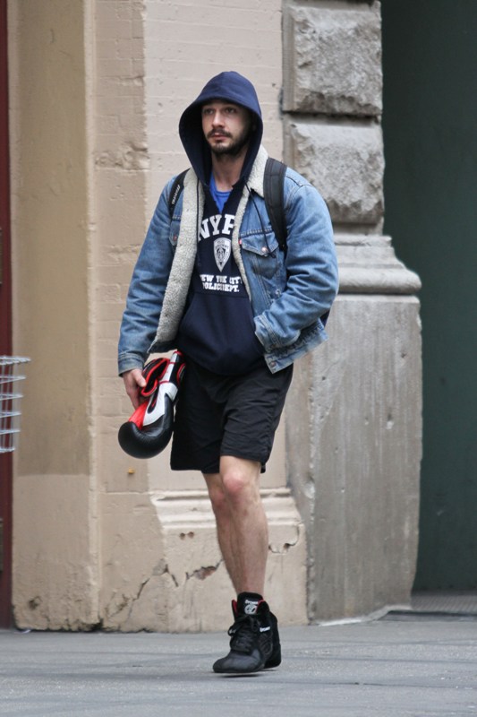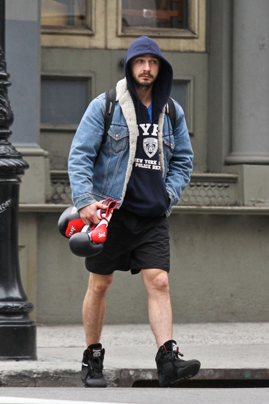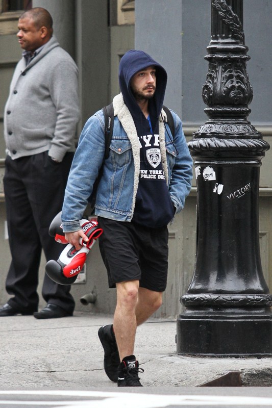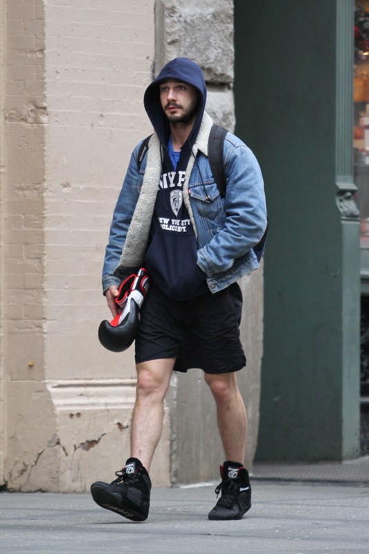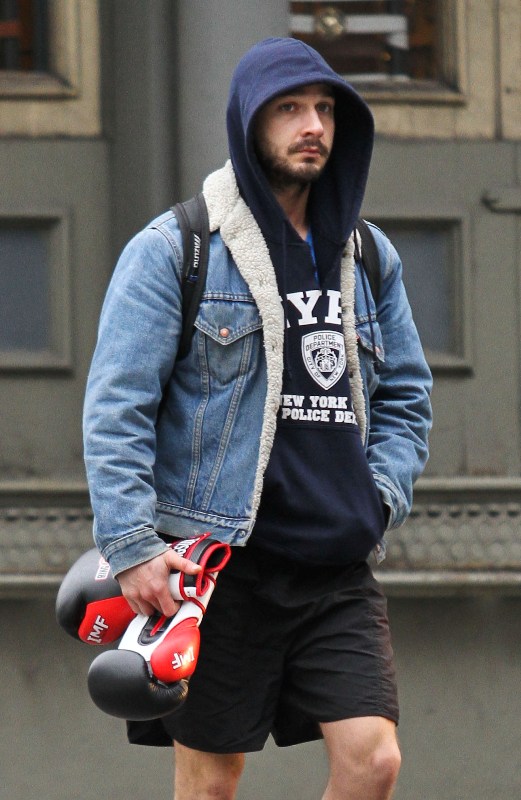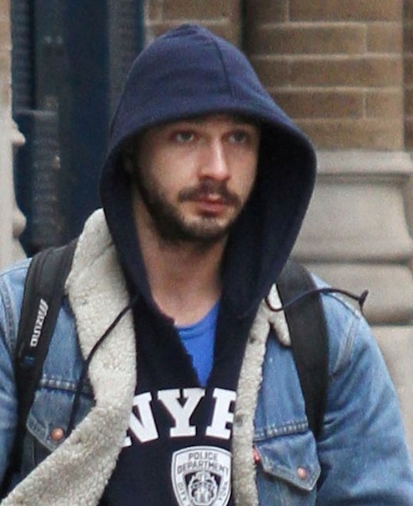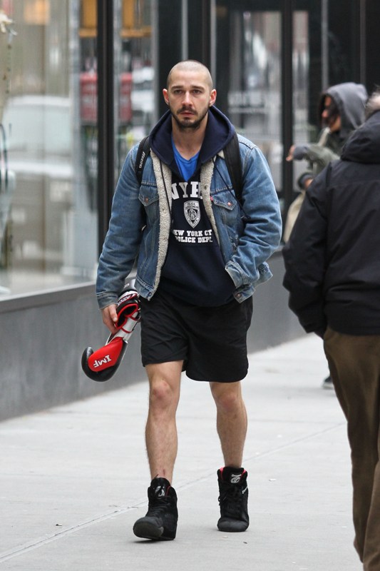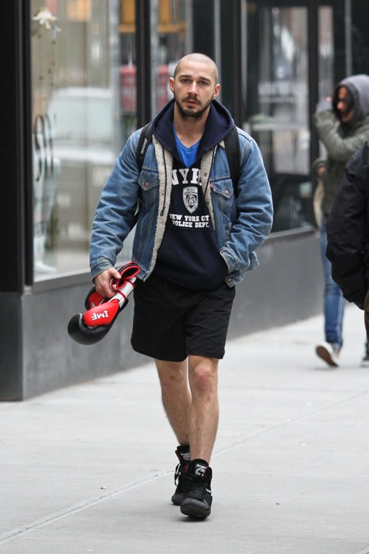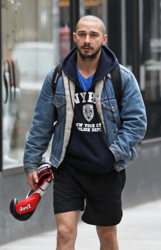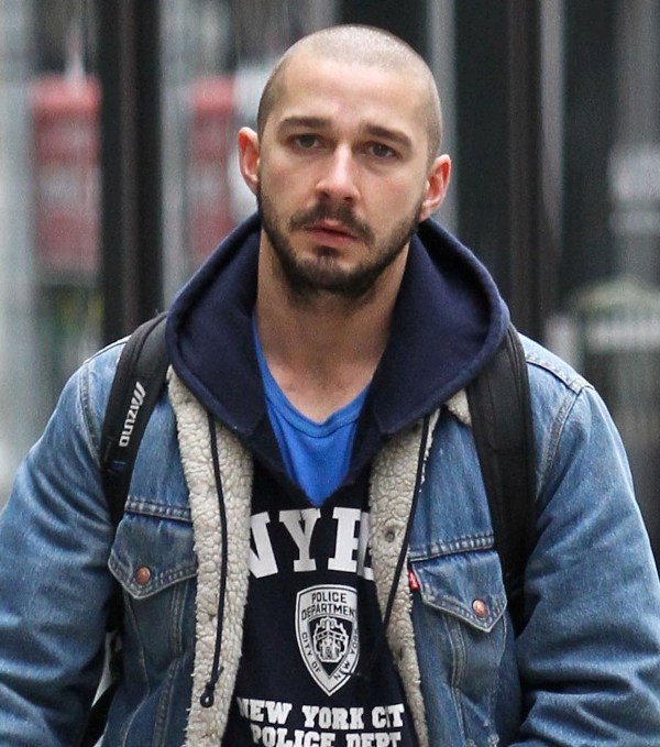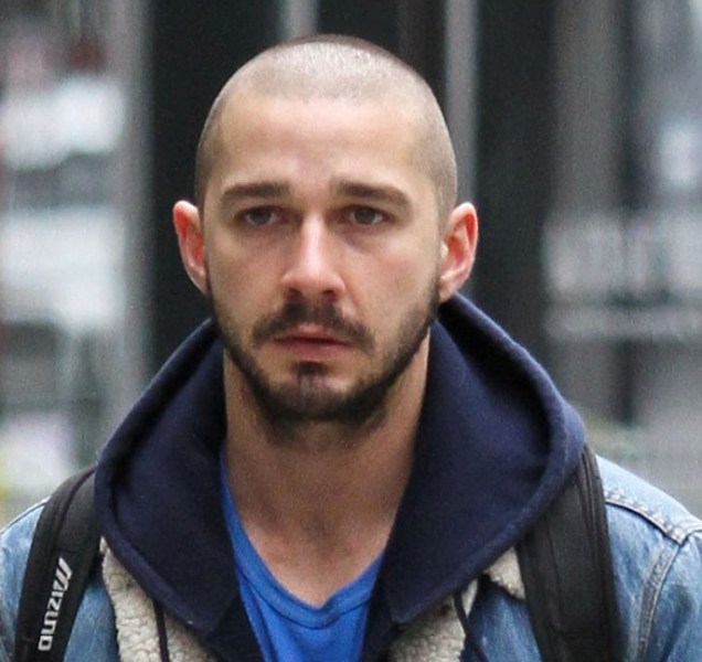 Attached -- Shia trying to be a badass with his bald head last week even though I just compared him to Justin Bieber.