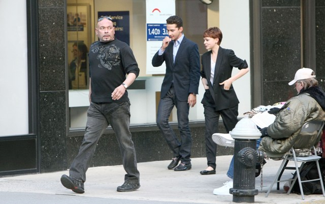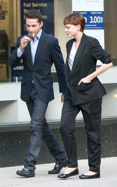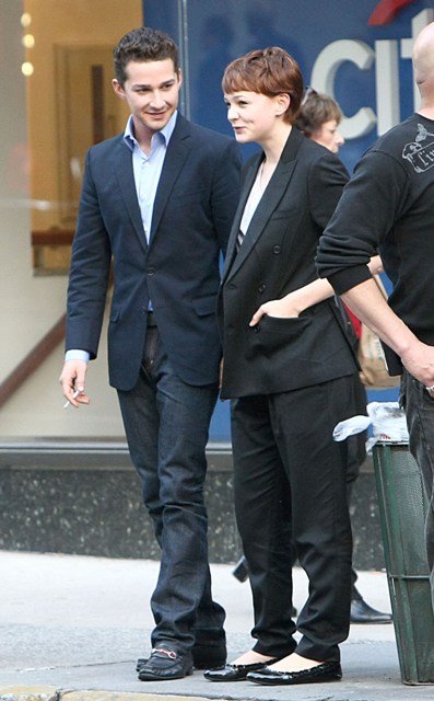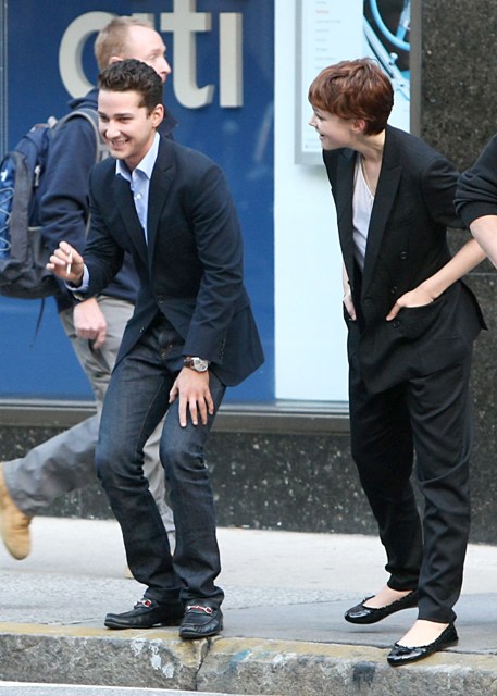 Hopefully she made him grovel. And promise not to be a whiny “me me me” narcissistic bitch boyfriend. Photo Assumption says he seems to be trying hard to keep his girl. A flirty Shia LaBeouf was on set yesterday with Carey Mulligan in New York shooting Wall Street 2, a remarkable departure from the sullen pouting baby we’re used to seeing.