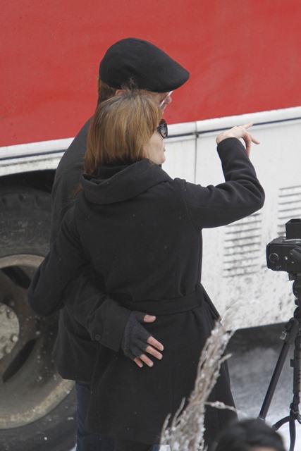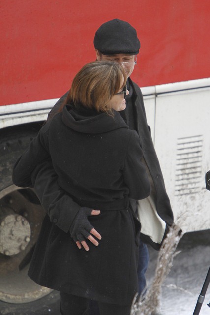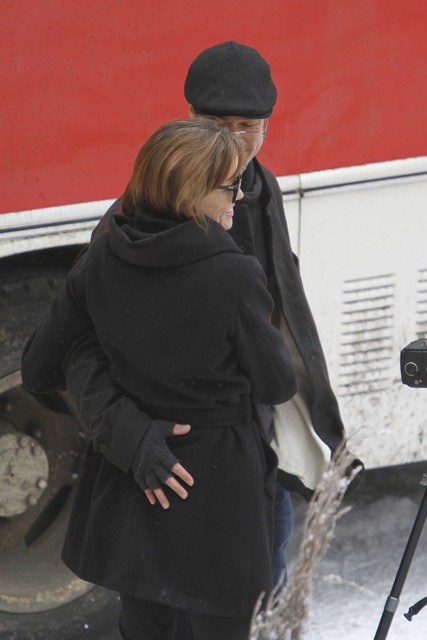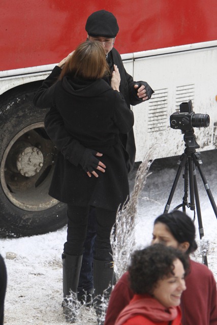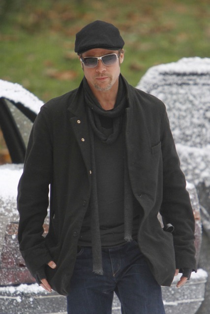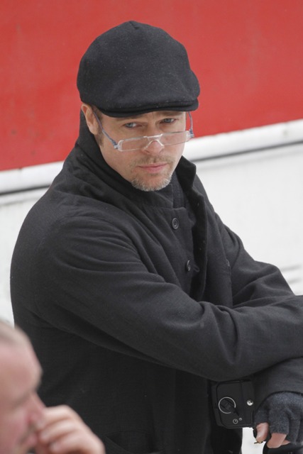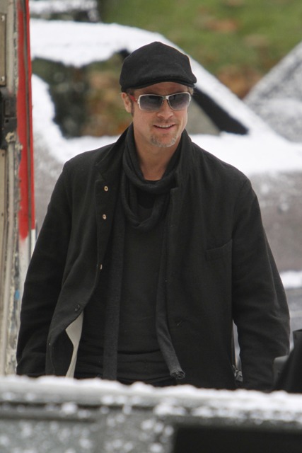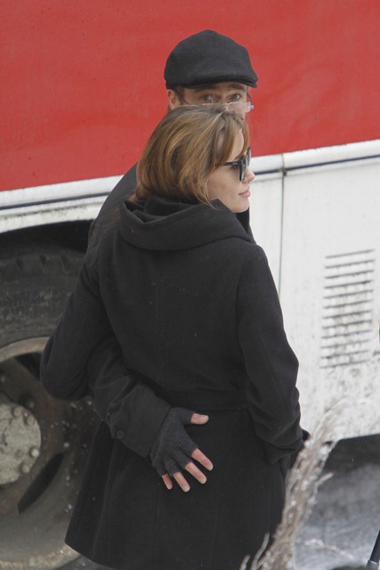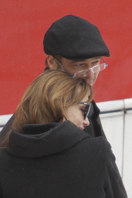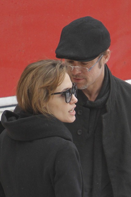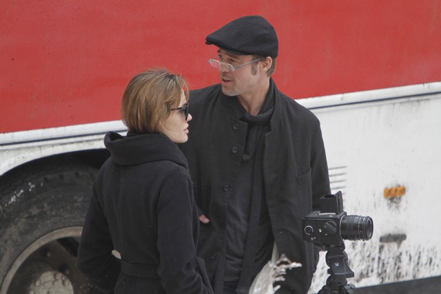 Brad Pitt joined the Jolie today on the set of her movie today taking pictures and generally just standing around being hot. And then they embraced. And there’s the money shot.