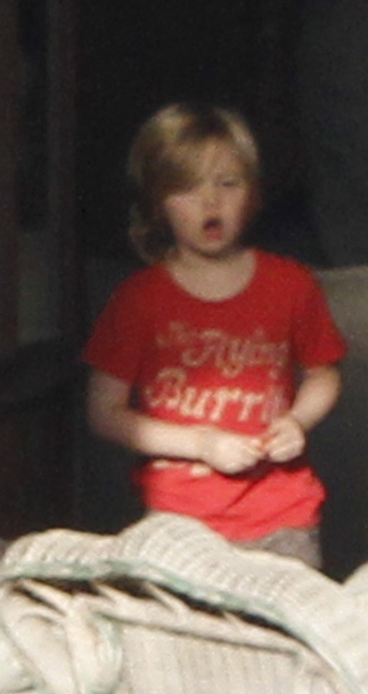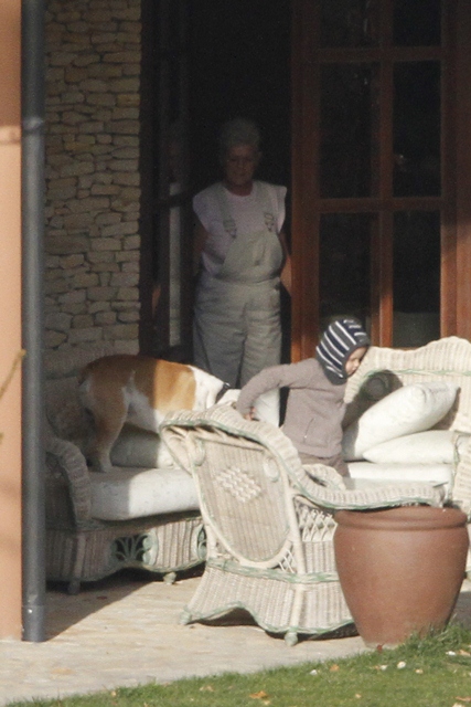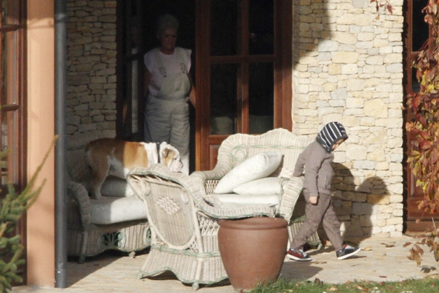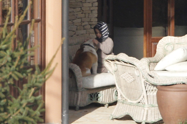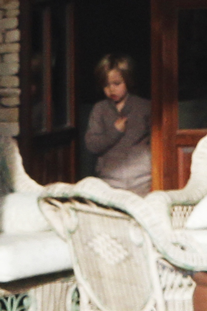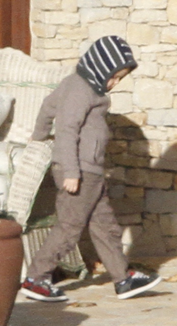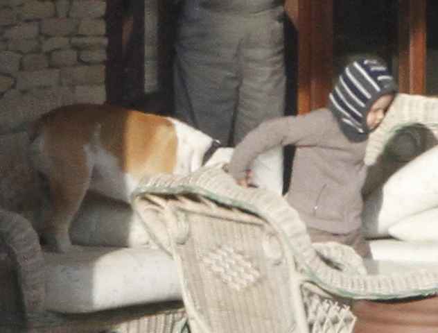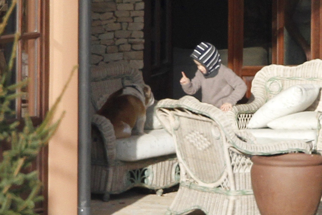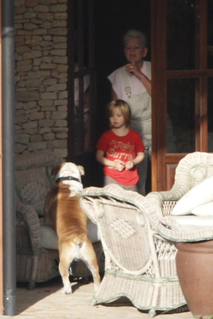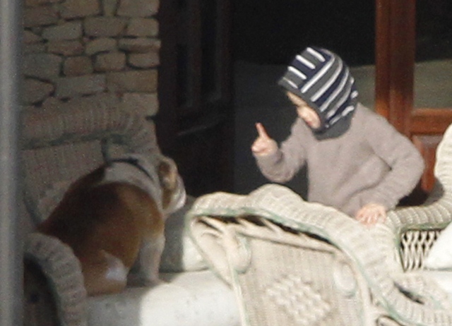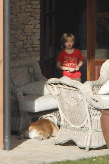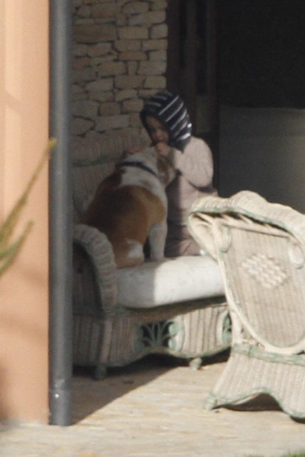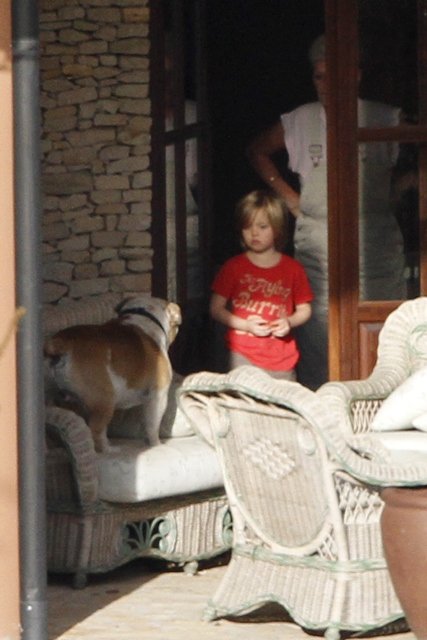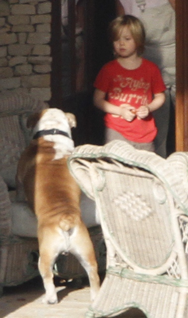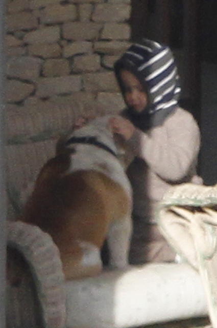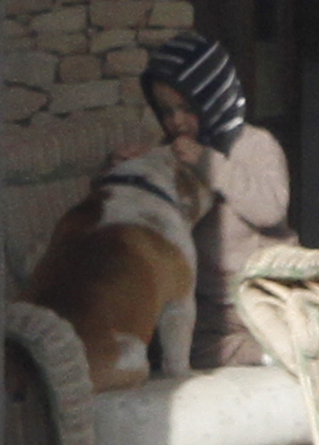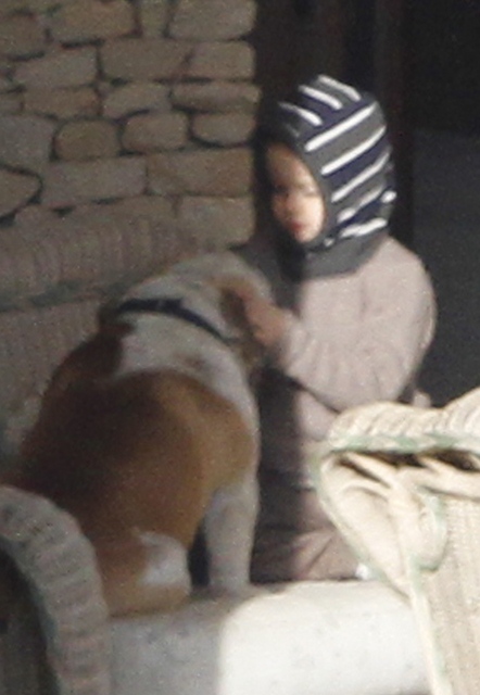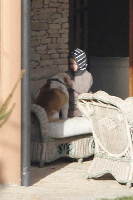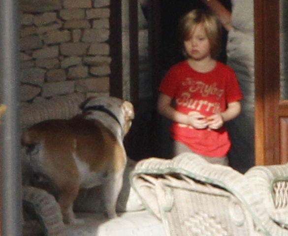 Meanwhile their daughter Shiloh was spotted back at the house hanging out with the Jack the bulldog. It looks like she’s scolding him with her finger. Then they make up and she rubs his ears. Then he’s lying down in frog position in a sun patch, and the one that kills me the most is the shot of her with her hood pulled over her head leading her faithful friend Jack away towards their next adventure. It’s so adorable I can’t stand it.