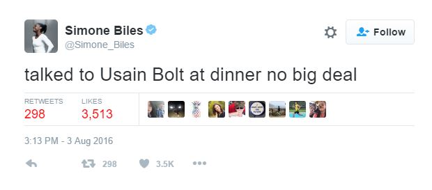In case you missed it, I am obsessed with Simone Biles. And it’s not just because I’m obsessed with gymnasts and she just might be the best gymnast ever, of all time. But also because I’m obsessed with Teen Life. And that tweet right there is Teen Life. Right now, though, it’s the most extraordinary teen life. She’s fangirling in Rio over Usain Bolt. But she herself, alongside Usain, is probably one of top 5 Olympians this year on the hype list. She might actually be getting even more attention than Usain.