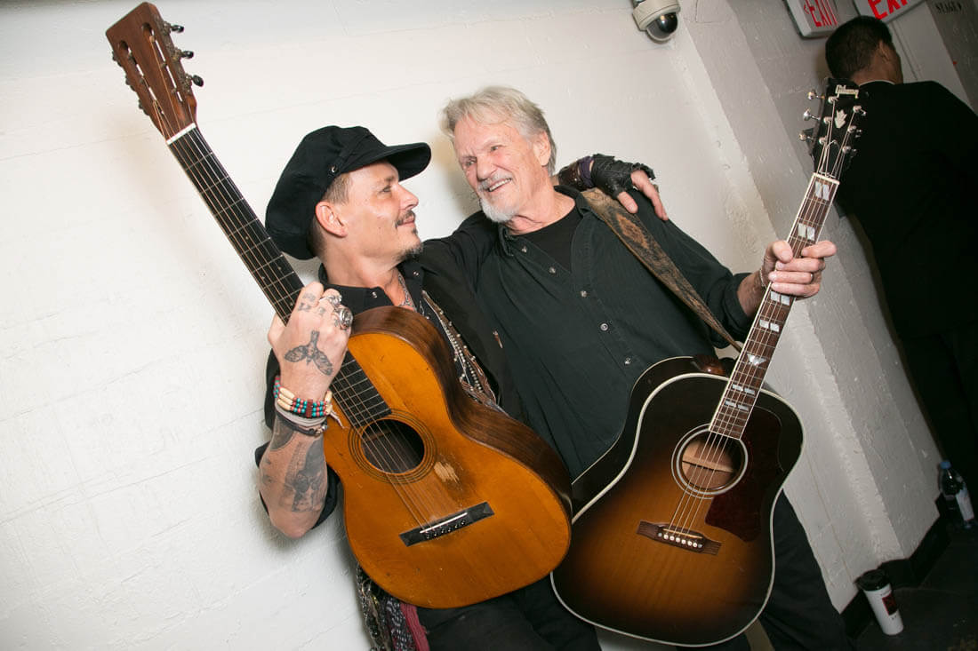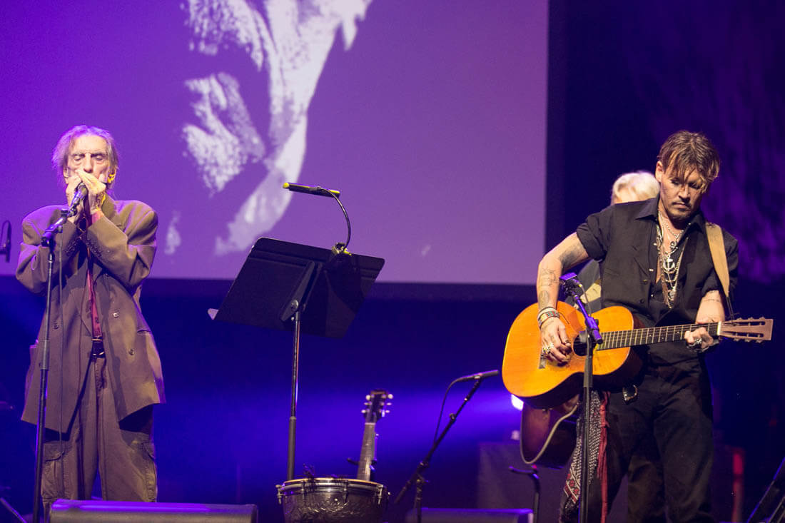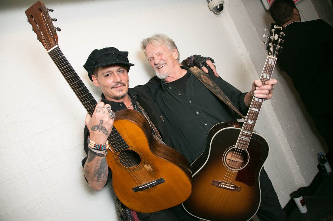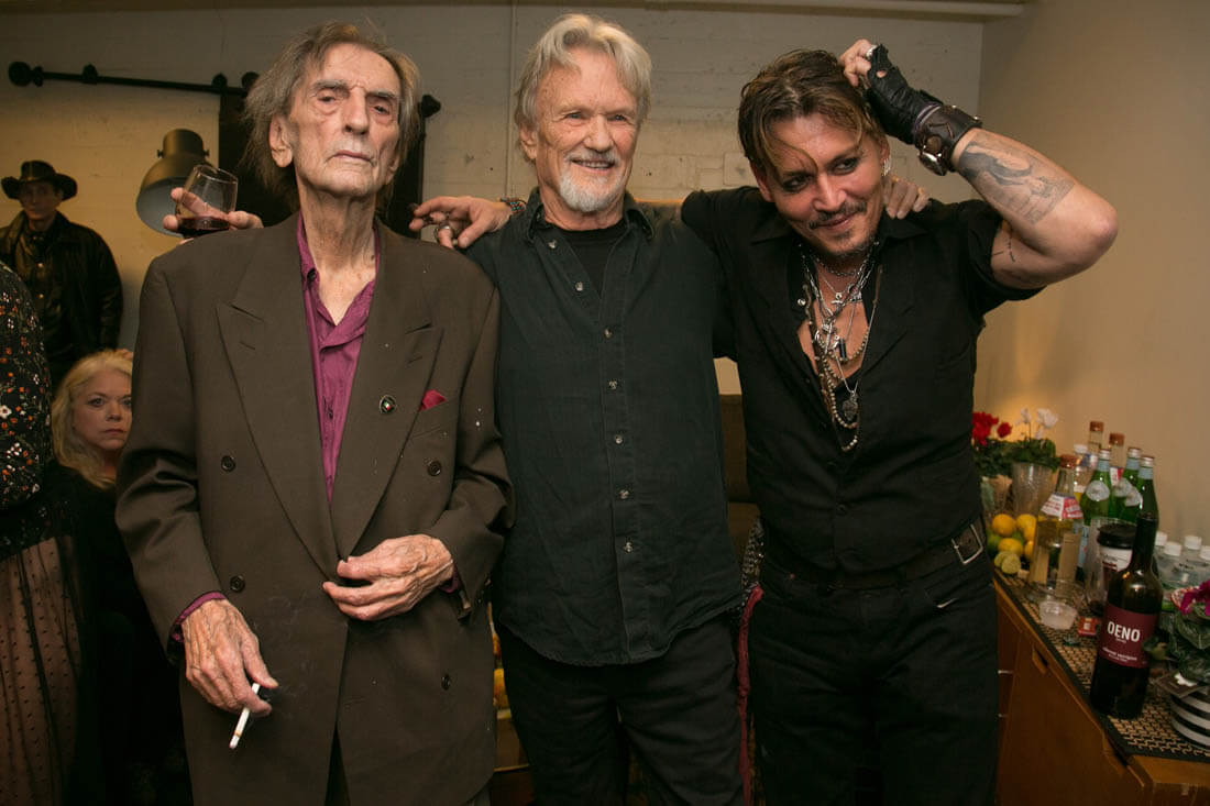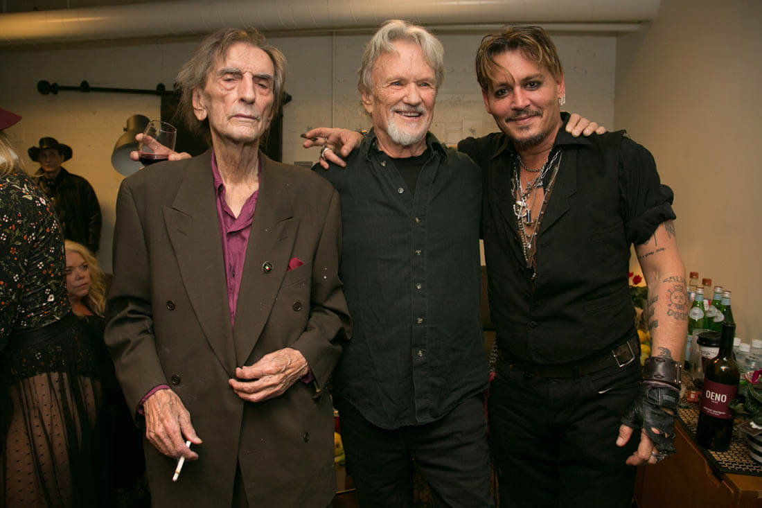 Here’s Johnny last night at the Vidiots Foundation event to honour Harry Dean Stanton. Have you ever been in a group photo and everyone’s trying to organise themselves and someone says, oh, I don’t want to stand next to x or y because they’re younger/thinner/whatever? If this has never been your experience, congratulations, clearly you are more enlightened. Anyway, this is what I thought about looking at these shots of Johnny surrounded by older men. And whether or not he must love this because, well, next to them, maybe in his mind the grossness that has taken over his face and his reputation might not be so obvious. Same applies when he’s with his band, The Hollywood Vampires, and hanging out with Alice Cooper and Joe Perry. You can squint and lie to yourself that this Johnny is still the one you remember. The moment he has to pose with, say, someone who is as pretty now as he used to be though, like beautiful Brenton Thwaites, the young actor in the new Pirates movie with him, the truth becomes harder to ignore.