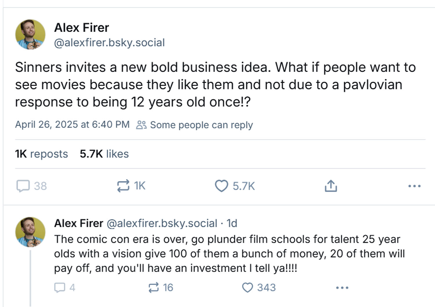 This has not been a great box office year so far, and Sinners is juicing the box office right on the brink of summer movie season, when we need positive momentum to carry us into this critical period for the industry. And even with Thunderbolts* opening this weekend (tracking for a respectable $60-80 million opening), I expect Sinners to continue holding up—it will have good legs. Word of mouth will keep spreading, now aided by headlines about its record-breaking second weekend. More people will get curious about it, which means more people will go see it. A rising tide lifts all boats, and Sinners is a huge win for everyone.
