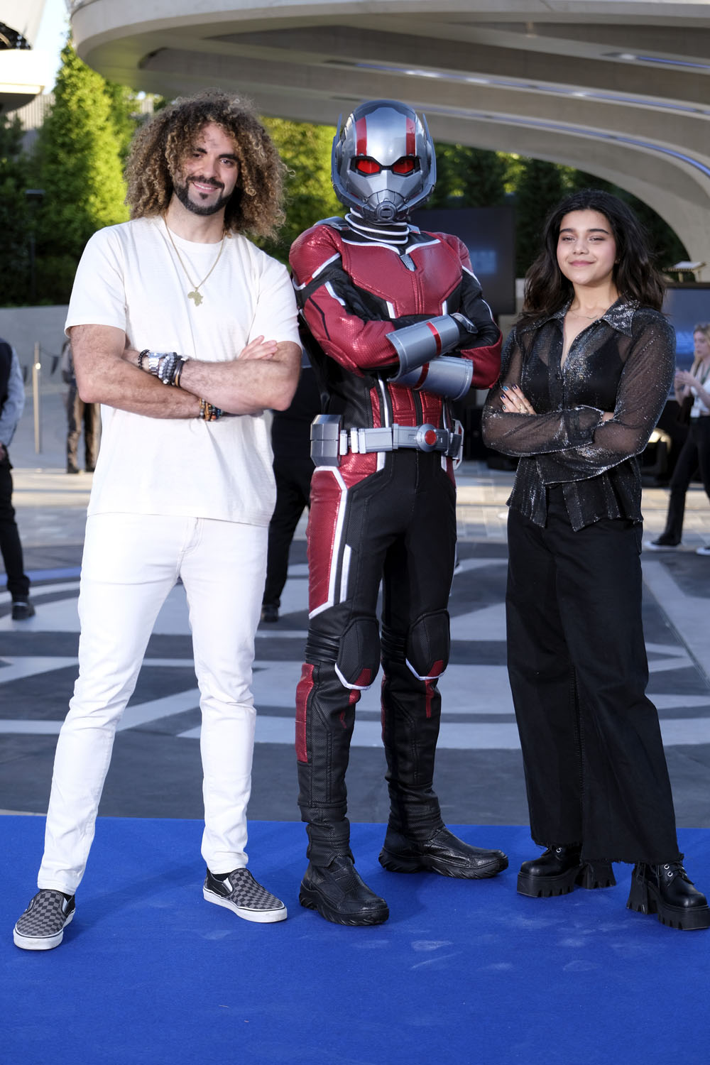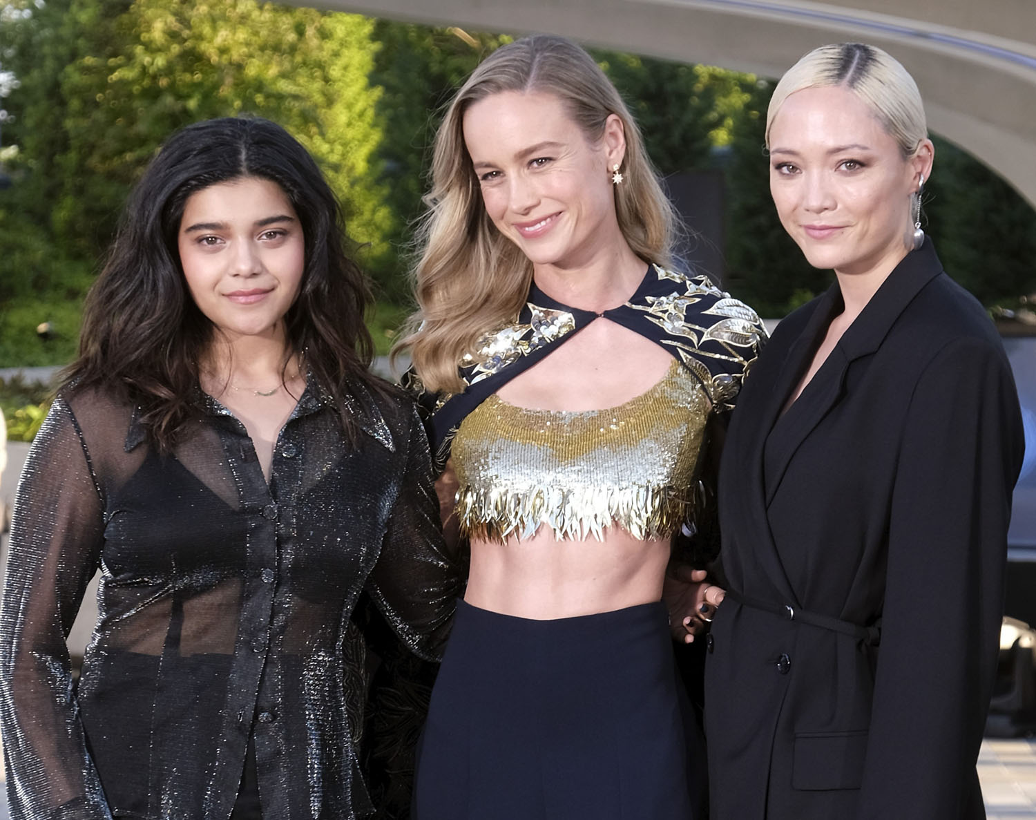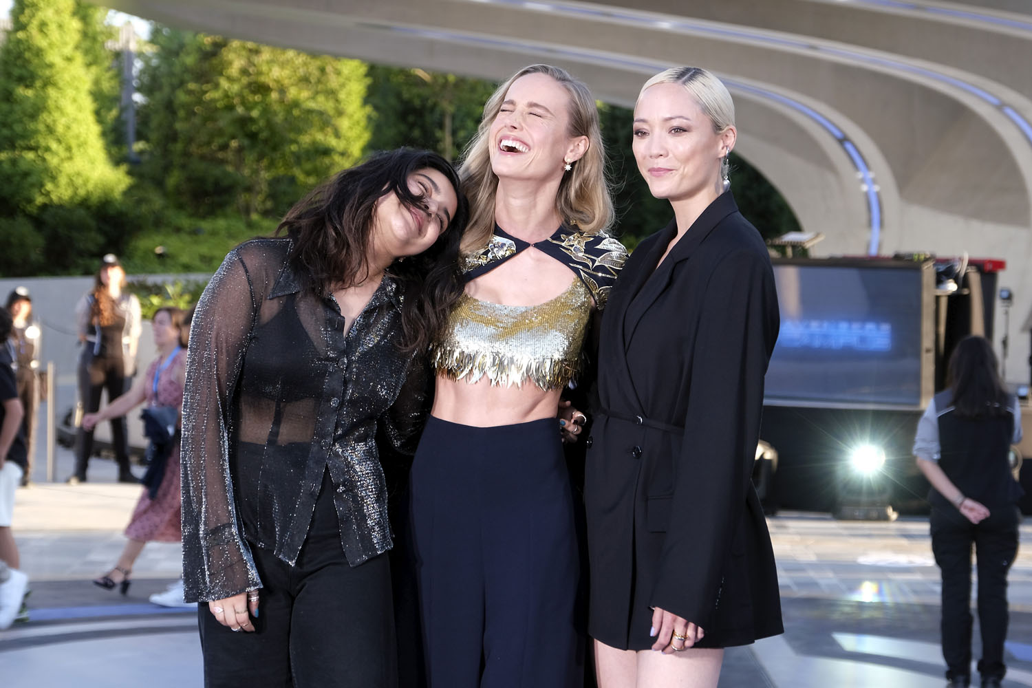 Attached- Iman Vellani with Brie Larson and Pom Klementieff at the Marvel Avengers Campus opening ceremony at Disneyland Paris on July 09, 2022 in Paris, France.