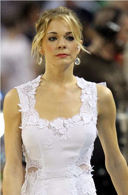 Not sure why the NCAA asked LeAnn Rimes to sing the national anthem at the game yesterday. But she was there, along with Eddie Cibrian, in Houston for the championship game, proudly flaunting her healthy legs in a white dress and huge heels.