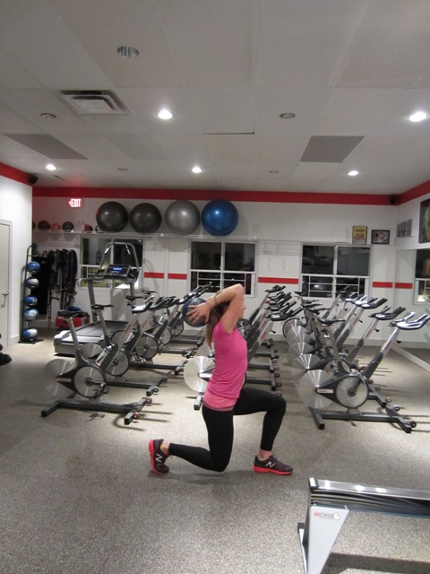 In this exercise you want to start in a lunge position with your arms extended up over your head. As you lower yourself down into the lunge bend your arms at your elbows and lower the medicine ball behind your head, making sure that your elbows remain directly over your shoulders and pointed forward. As you stand back up out of the lunge straighten your arms. Do 20 with your right leg forward (you will do your left leg the second time through)