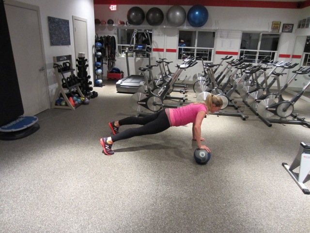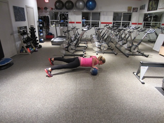 Place a medicine ball underneath your right hand and your left hand on the floor. Lower your body down until your shoulder is slightly below your hand, squeezing your shoulder blades together as you do lower down. Make sure that you keep your core tight and that your hips do not stick up into the air. Do as many as you can until you fatigue and set a goal each time you do this exercise to do one more than you did the last time. You will do the left hand the second time through. (This can be modified by doing the push ups from your knees if you are unable to do them from your toes)