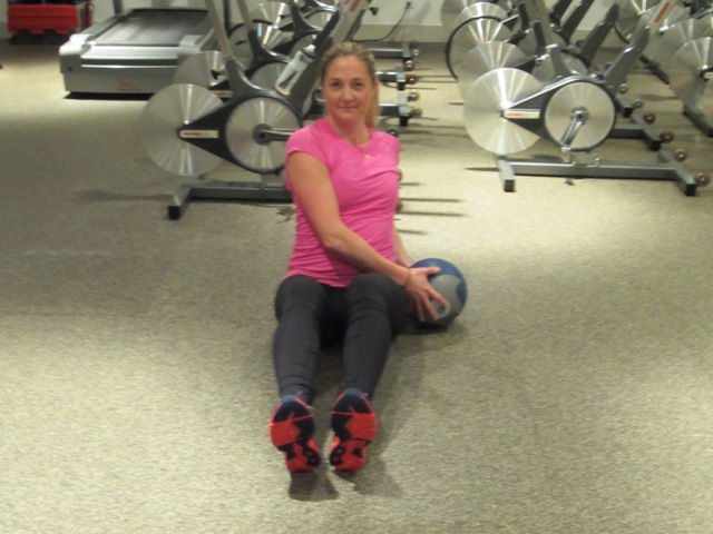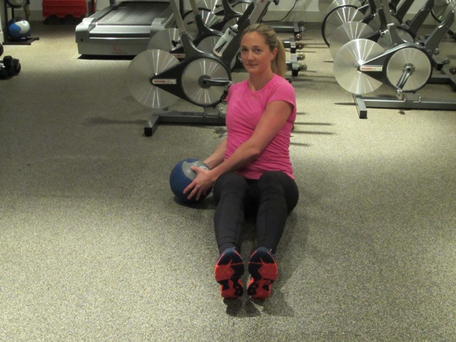 In a seated position, with your back flat and chest lifted up tall rotate through your torso touching the ball to your left hip then to your right. Make sure as you rotate you are rotating from your core muscles not just using your arms. If you want to make this exercise more difficult you can raise your feet off of the floor. Make sure as you twist that your legs stay completely still. Do this for 60 seconds or until fatigue.