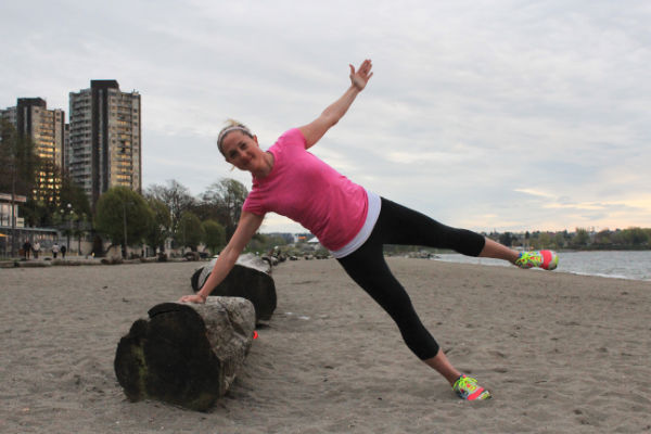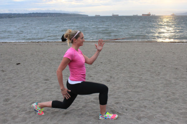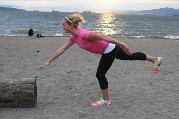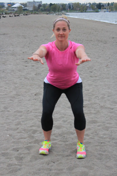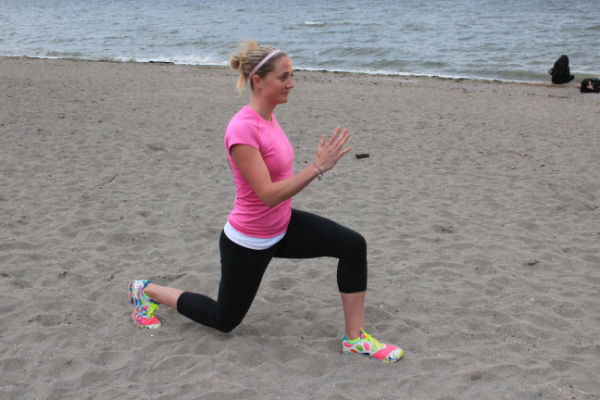 1 – Squat to a forward lunge. Start with a squat and as you stand up lift up 1 leg and then step forward into a forward lunge. Push yourself back up to standing on 1 leg then back into a squat. Repeat this 10 times on 1 side then 10 times on the other. Each time you do this exercise make sure you start with the opposite leg. For example, if you start lunging with your right leg on Monday, then Wednesday start with your left leg. This exercise trains your legs in a multitude of plains.