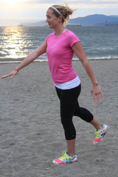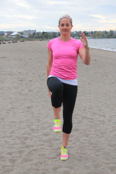 4 – Single Leg Dead Lift – This is a great exercise to help improve your glute strength, your balance and your hamstring flexibility. Standing on 1 leg you will slowly lower your body towards the ground as you reach your arm out in front of you. It is very important that you maintain a straight line from your heel to the top of your head and if your upper body is lowering, your leg is rising. As soon as you are no longer able maintain a flat back, return to the standing position by activating your hamstrings and glutes, staying on 1 leg. Repeat 10-15 on 1 side then switch to the other leg.