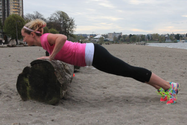 2 – Push up into a star bridge. Using a bench, position your hands slightly wider than shoulder width apart and your body weight positioned directly on top of your hands. Lower your body towards the bench while keeping your chest positioned between your hands, until your elbows are bent to 90 degrees or lower. After you have pushed your body up, lift up one arm and leg towards the sky as you rotate into a star position and hold this position for about 5 seconds. Complete 10-12 reps, alternating between your right and left side. This exercise will strengthen your core and upper body and glutes.