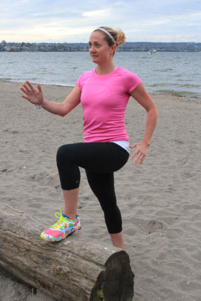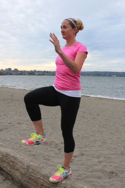 5 – Step Ups. This is another great exercise to strengthen your leg and hip muscles. Place 1 foot up on a bench and drive up the opposite knee, making sure that the knee of the leg you are stepping up on does not extend past your toe and stays in line with your big toe, your body remains tall and as you lower yourself back down you do it with control. Repeat 10-15 on 1 leg then repeat on the other side.