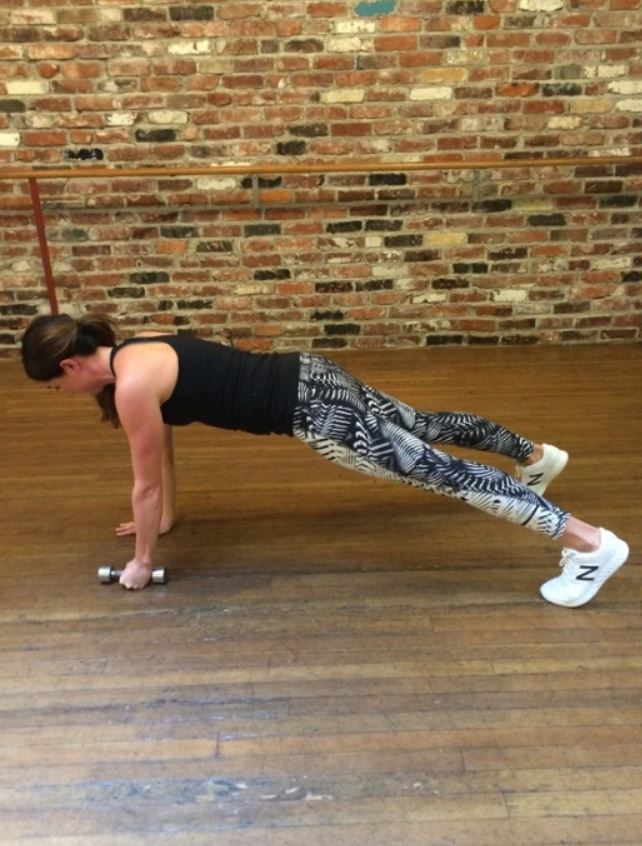 This is one of my favourite, and go to, upper body exercises. Not only does it target your back and arms but it also will strengthen your core and help improve your posture. Place a 5 to 10 lb dumbbell on the floor and come into a push-up position over it, with the weight centered directly beneath your breast bone. Maintaining a level pelvis, grab the weight in your right hand and begin to lift it towards your waist while rotating through the ribs and pelvis. Keep the weight close to you as if you are shooting a bow and arrow while continuing to rotate and reach your arm straight. Once you reach the top, bend your elbow and rotate back towards the floor, keeping the weight close to your body. Continue this for 60 seconds, alternating arms each time. If you have wrist issues then do this same exercise but in an elevated elbow plank.
