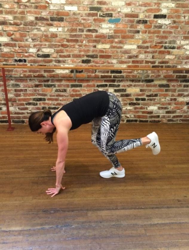 Start standing on one leg, bending forward from your waist and placing both hands onto the floor. Continue to walk forward on your hands until you are in a push-up position, which is when you will do 1 push-up and walk back up tall staying on that same leg. Start with 10, switching the standing leg each time. As you become stronger work up to doing 10 all on one side before switching and doing 10 all on the other.