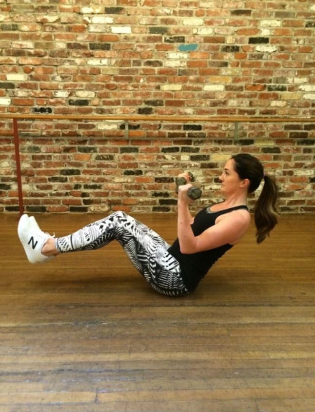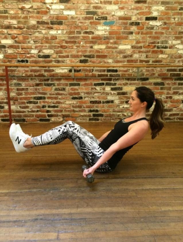 This is a great exercise to strengthen your abdominals while working your core at the same time. Sit tall on your sit bones, one dumbbell in each hand with your heels placed on the floor or legs up (only lift your legs if you can do so without rocking to the back of your sit bones). Extend your arms so they are straight and lifted off the floor and complete 10 to 20 bicep curls.