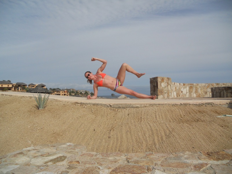 Begin in a side plank with your feet stacked and your body weight directly on top of your elbow and your top arm stretched out over your head. Without allowing your hip to drop bring your top knee and your top elbow towards each other without letting your torso flex (use your core muscles to keep your body as still as you can). Return back to the starting position and repeat. Start with 10 and work up to 20. If this is too hard for you then you can bend your bottom leg and place your knee on the ground rather than your foot.