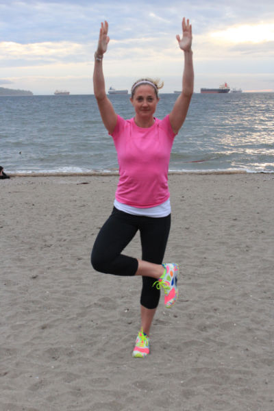 2 - Standing four stretch. Standing on one leg, place the opposite ankle on top of the knee and balance. Slowly lower your hips behind you, as if you are sitting into a chair, until you feel a gentle stretch of the glute muscles. Hold for 2 seconds then stand back up tall while keeping your arms extended towards the sky. Repeat 10 – 15 times on each side.