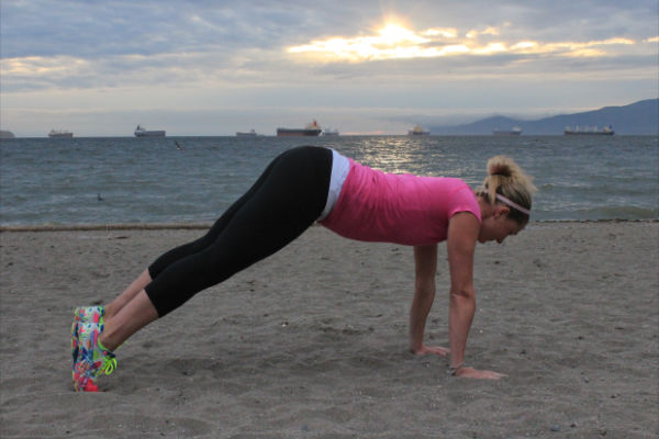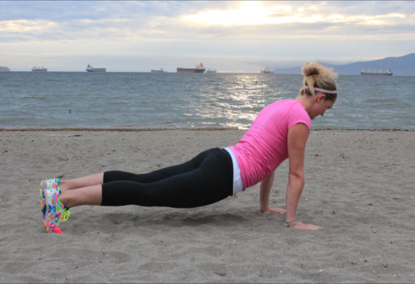 3 - Pikes. In a push up position, lower your hips towards the ground while keeping your arms straight. Engaging through your lower abs, explosively lift your hips up into the air, while keeping your body weight over your hands and your core muscles. You should lower on a count of 3 seconds and lift on a count of 1. Start with sets of 10 and as you become stronger work your way to 15, then 20.