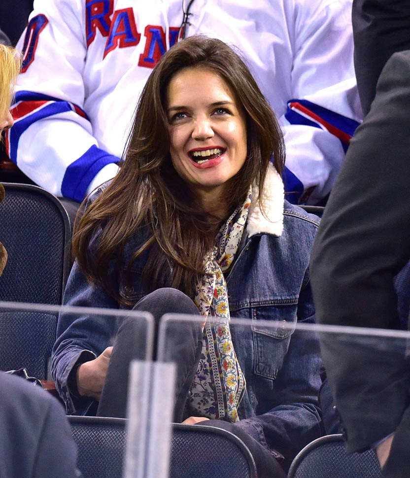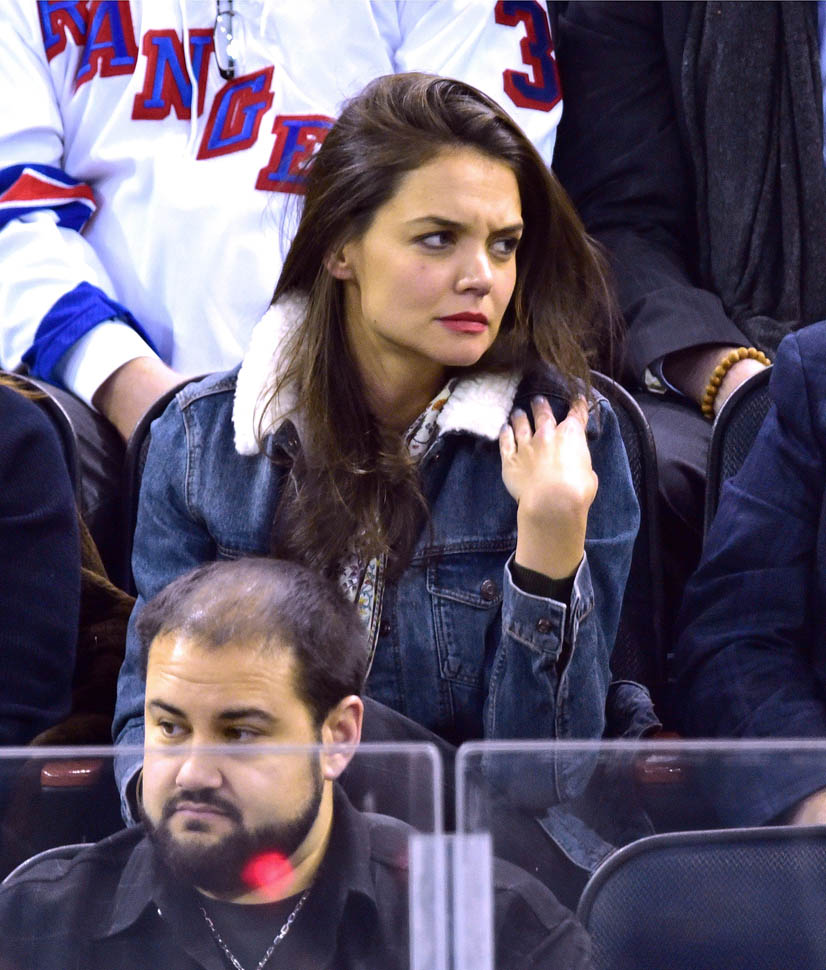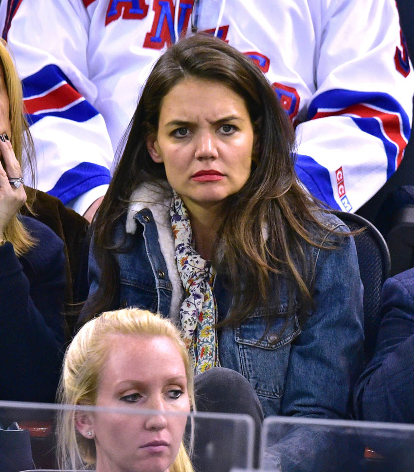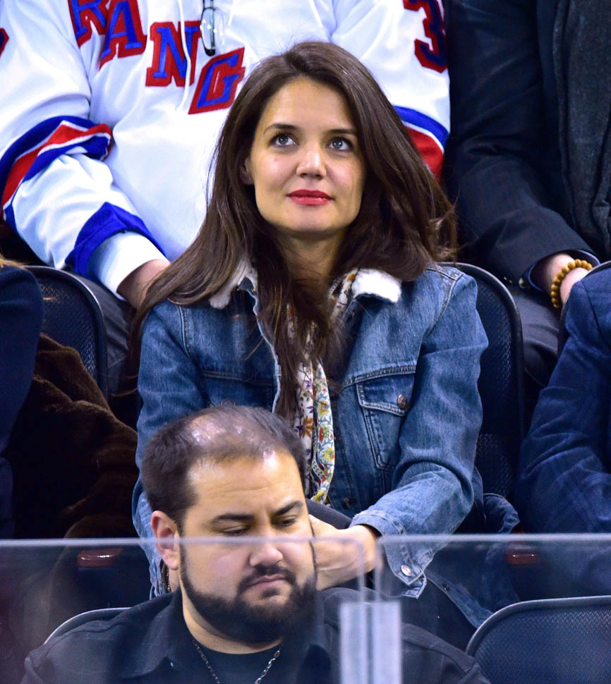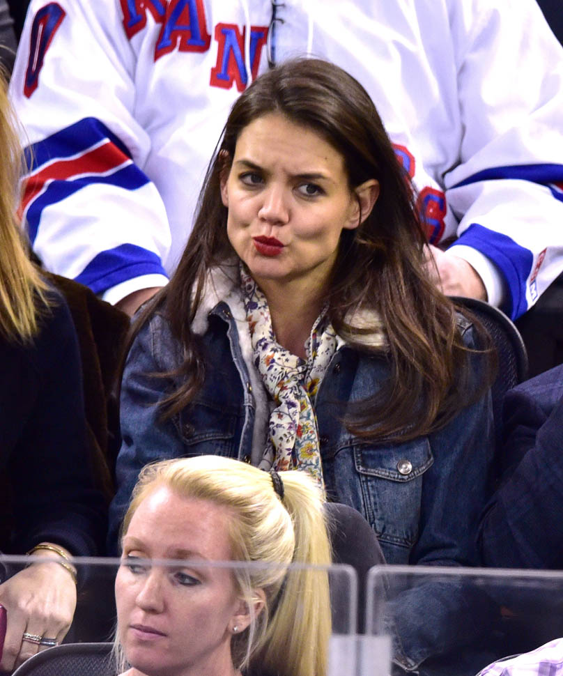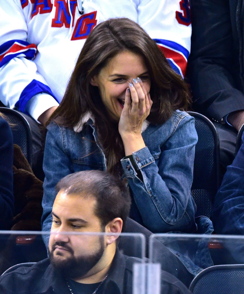 Katie Holmes was at MSG last night where the Rangers hosted the Islanders. Overseas, where football/soccer is concerned, they call that a “derby”. Katie had really good hair and even looked quite animated. This is because you can’t hear her talking.