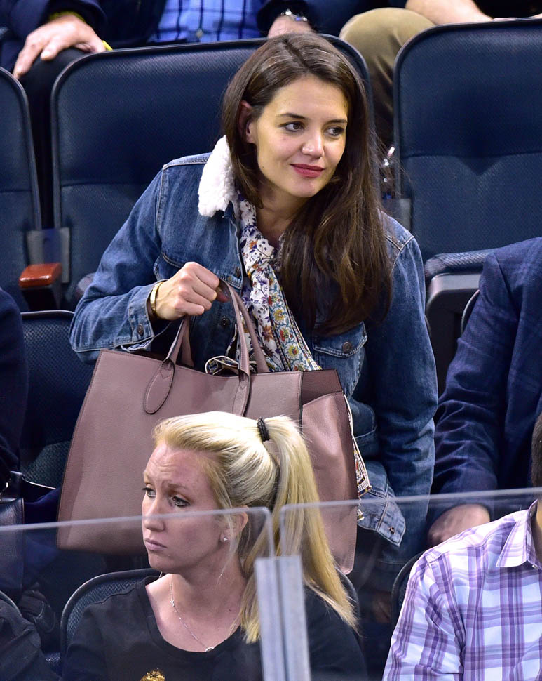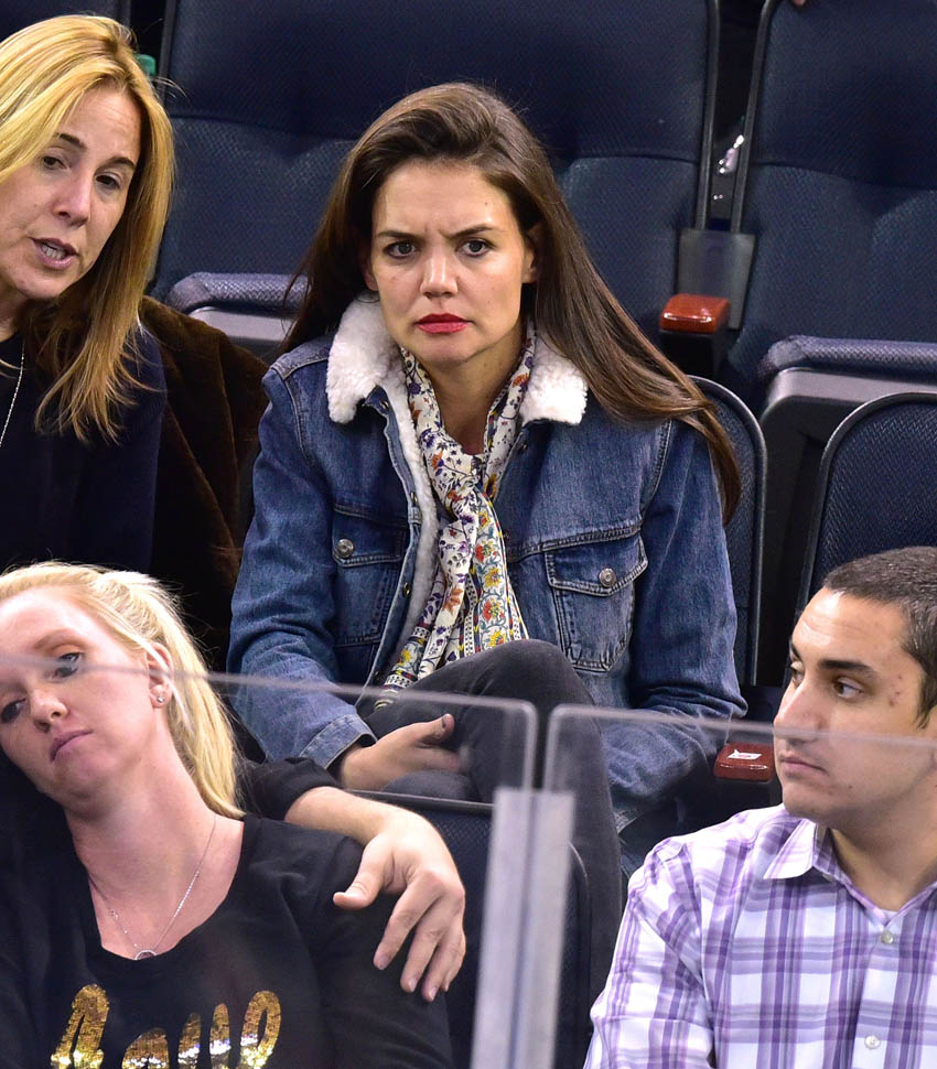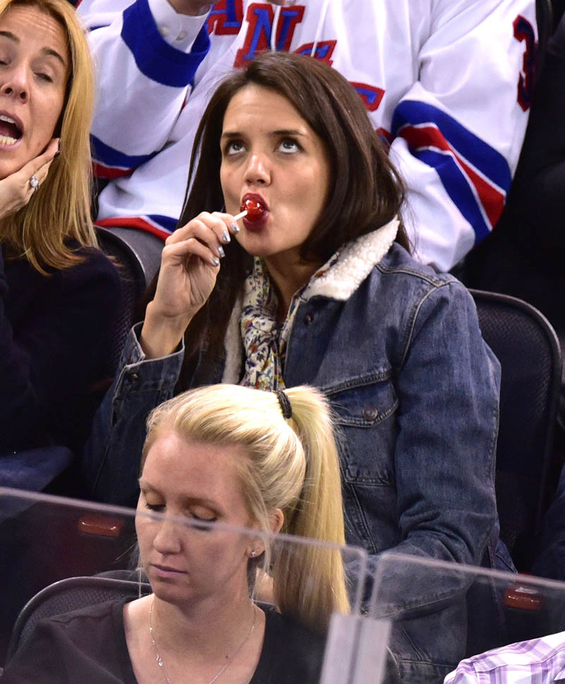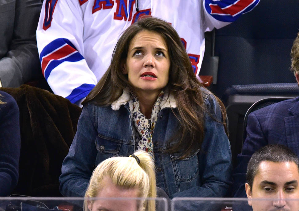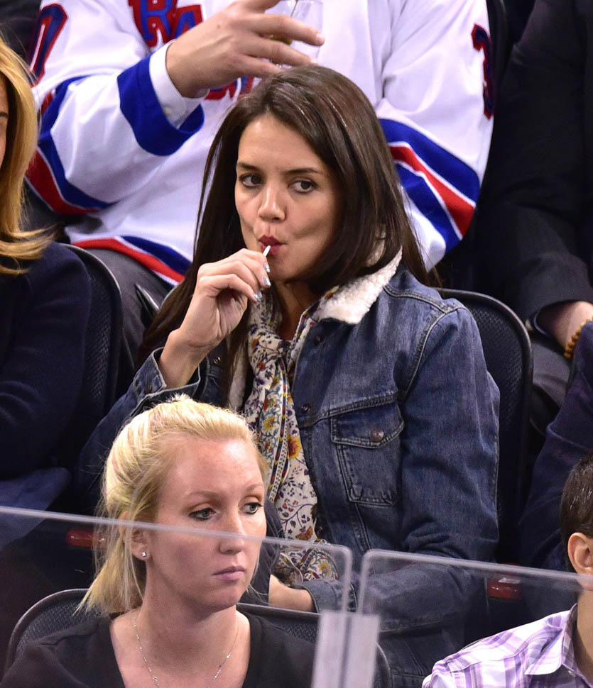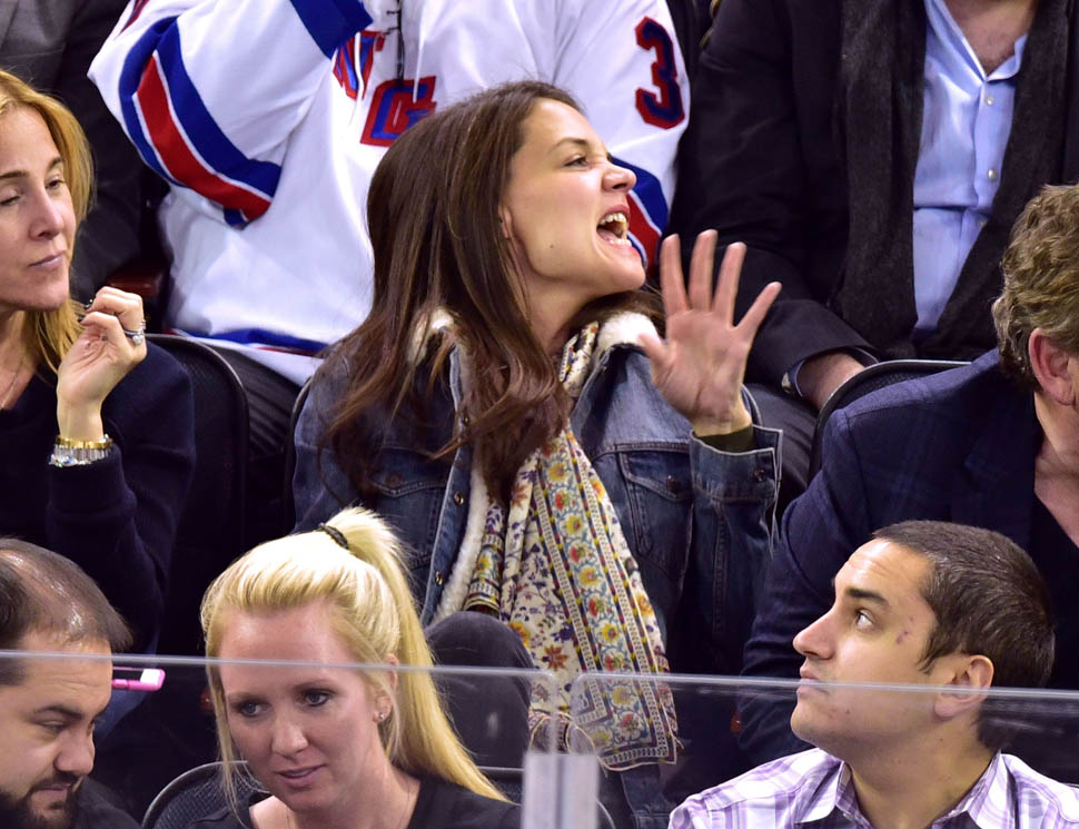 Katie Holmes was at MSG last night where the Rangers hosted the Islanders. Overseas, where football/soccer is concerned, they call that a “derby”. Katie had really good hair and even looked quite animated. This is because you can’t hear her talking.