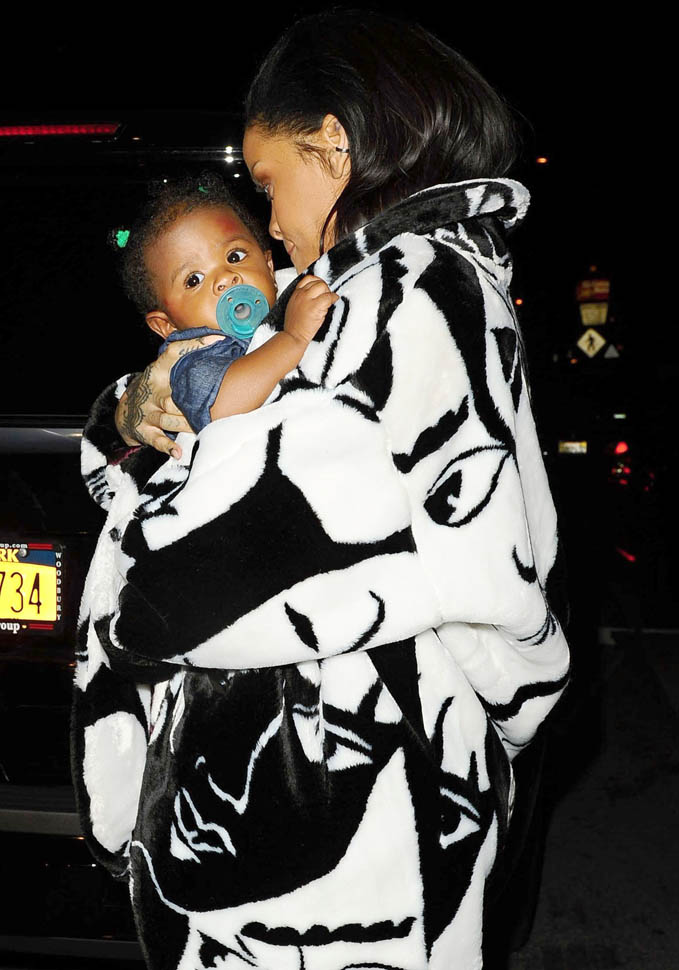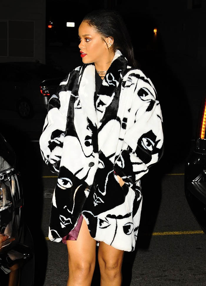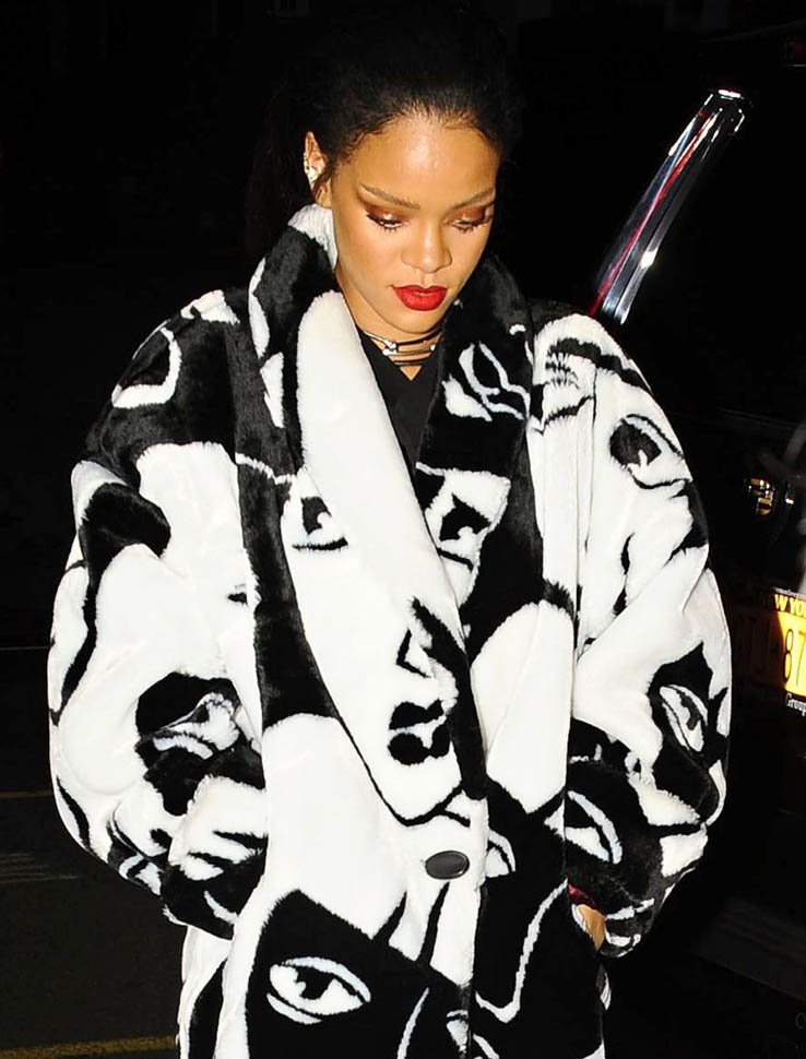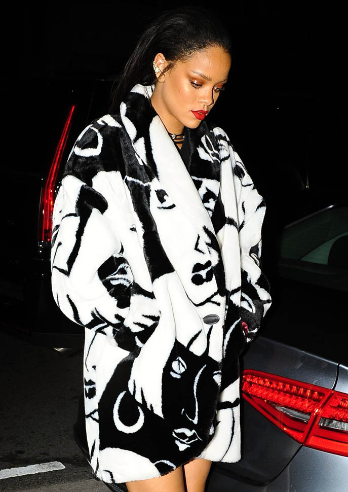 Rihanna was out for dinner last night at her favourite restaurant, Giorgio Baldi. She was photographed carrying her cousin’s baby wearing a coat with faces all over it. It’s faux fur. And it’s MAGNIFICENT. Click here for the designer. Of course it’s seen on her first.