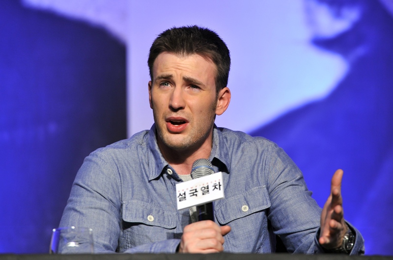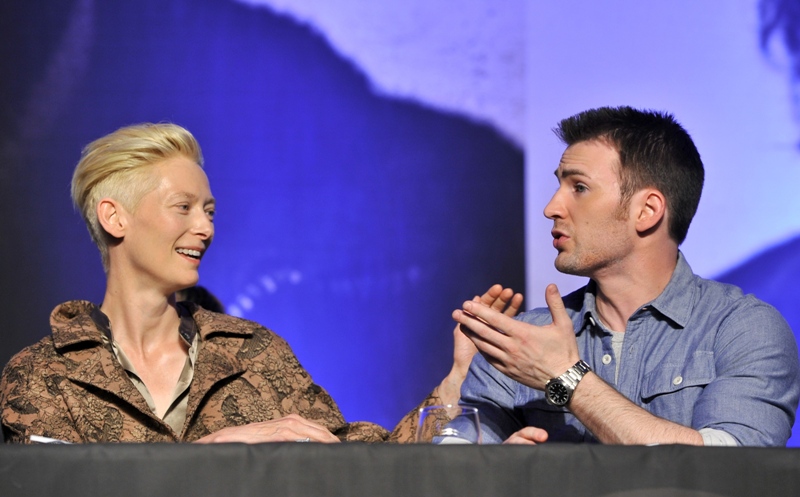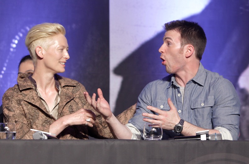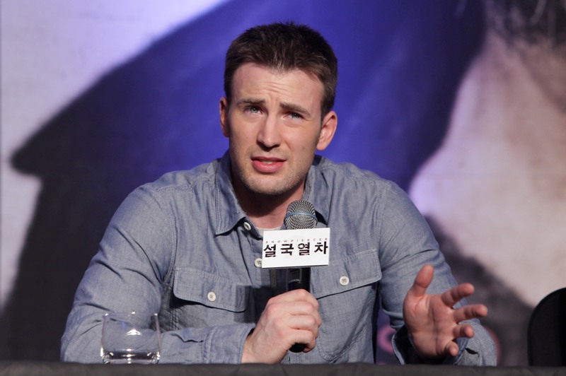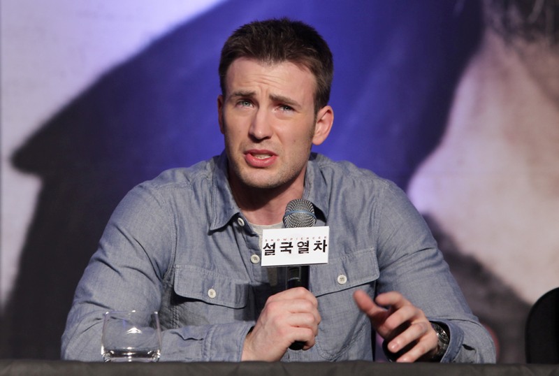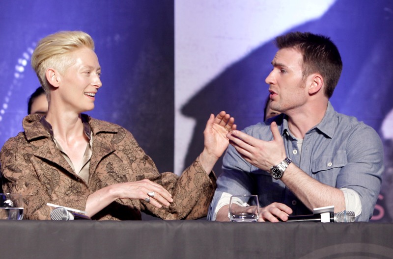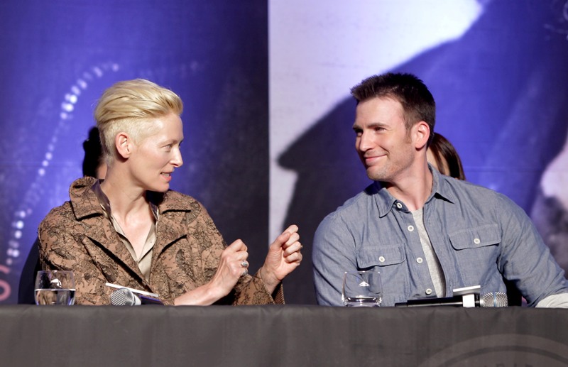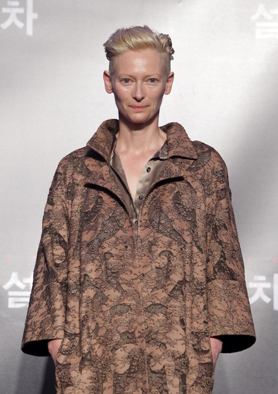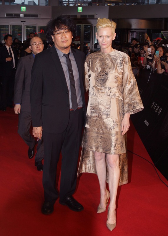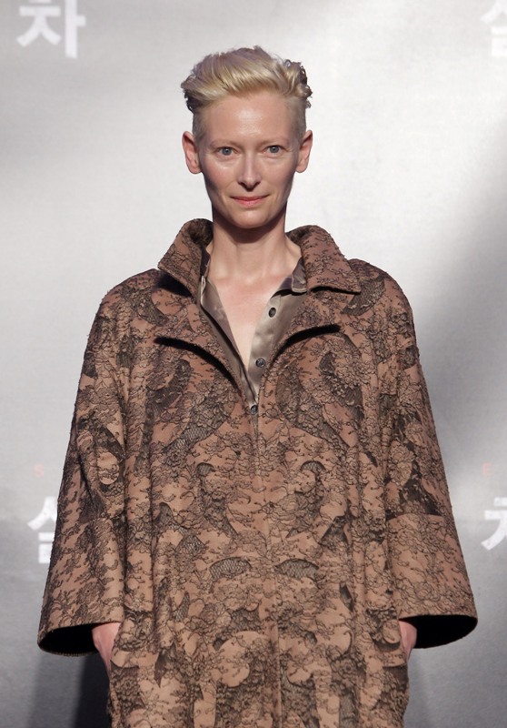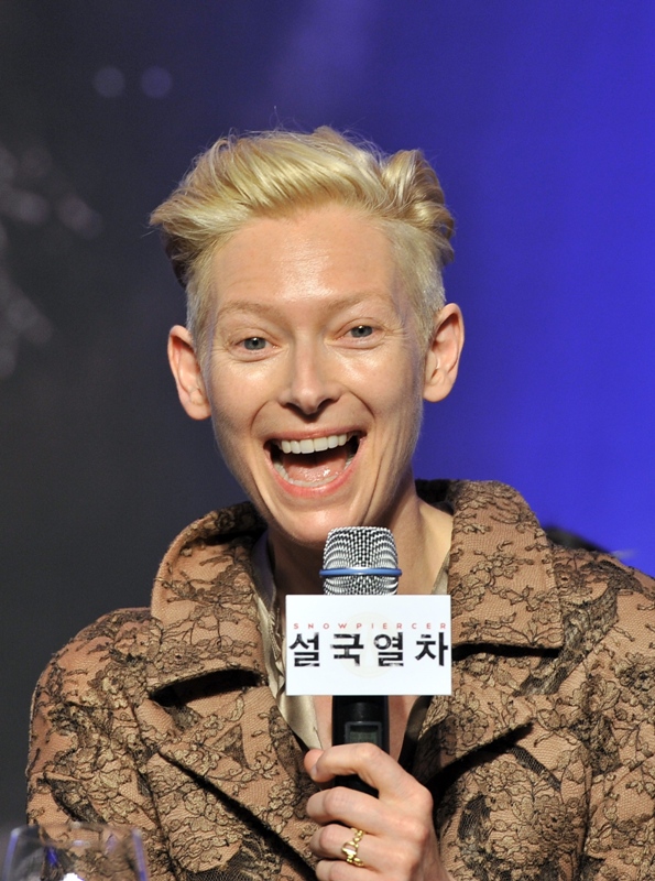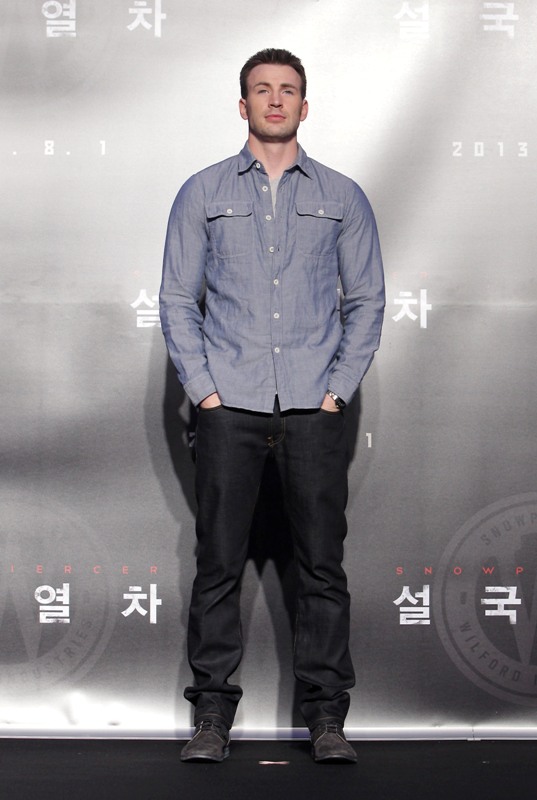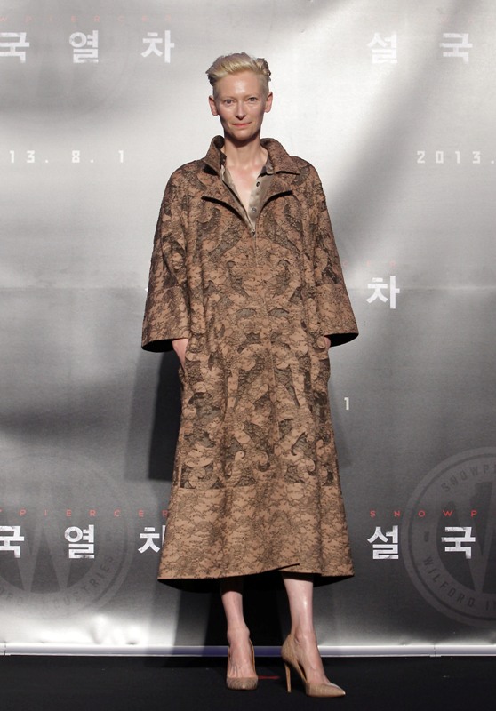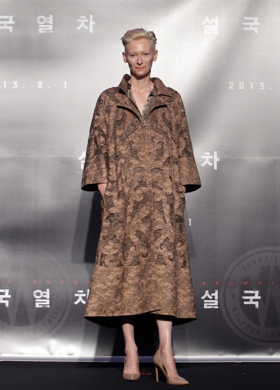 Snowpiercer doesn’t have a US release date yet (keep an eye out for it, though), but it is opening this week in South Korea, which is where the director, Bong Joon-ho, is from. Our Alien Queen, Tilda Swinton, showed up to the premiere in her pajamas. After I wrote about the trailer, reader Taina emailed about Swinton’s “formal pajama game”, and now that she’s pointed it out, all I can see when Queen Tilda goes anywhere is pajamas. She’s totally wearing pajamas! And yet, she is still Our Alien Queen, in her elegant pajamas. Chris Evans, on the other hand, showed up looking like a giant dork. Sometimes I think he’s a musical nerd stuck in the body of a high school quarterback, like he’s one second away from jazz hands.
