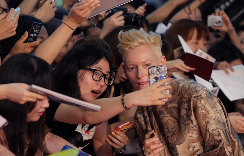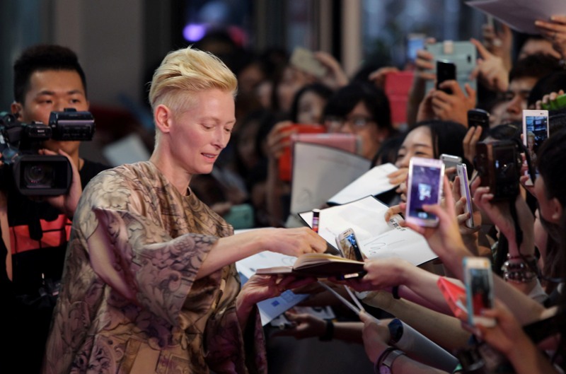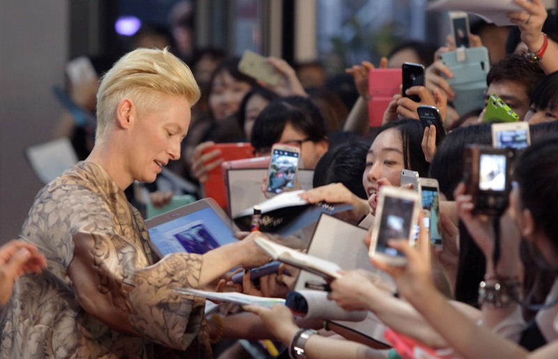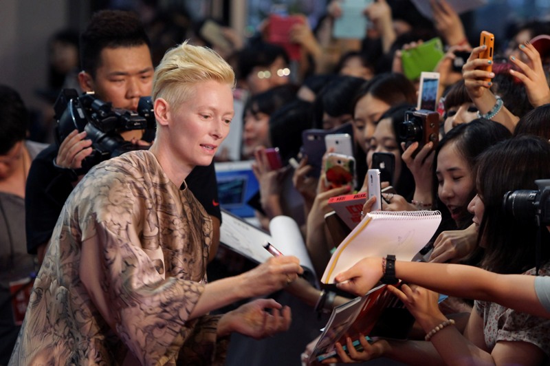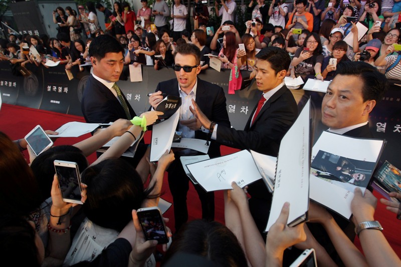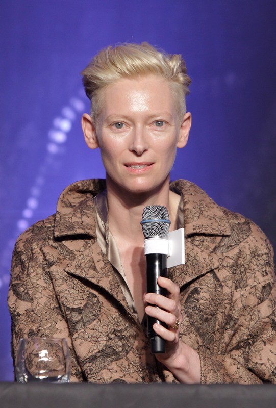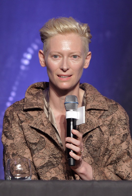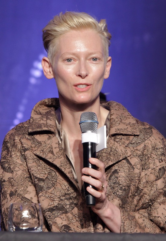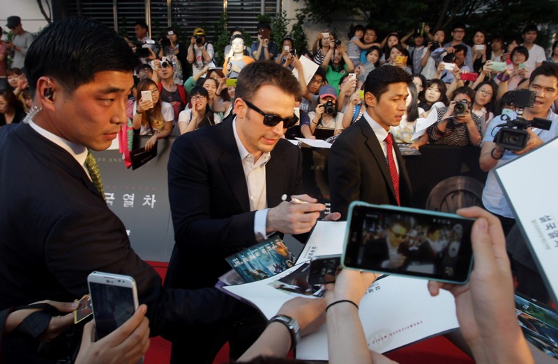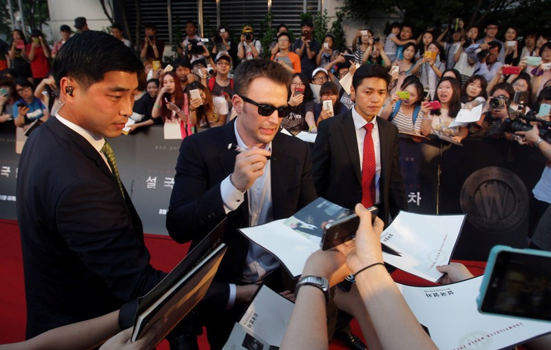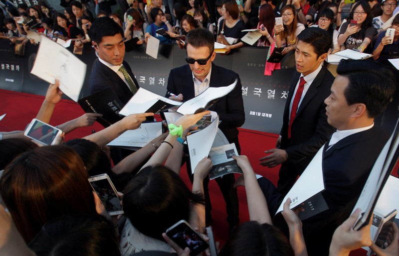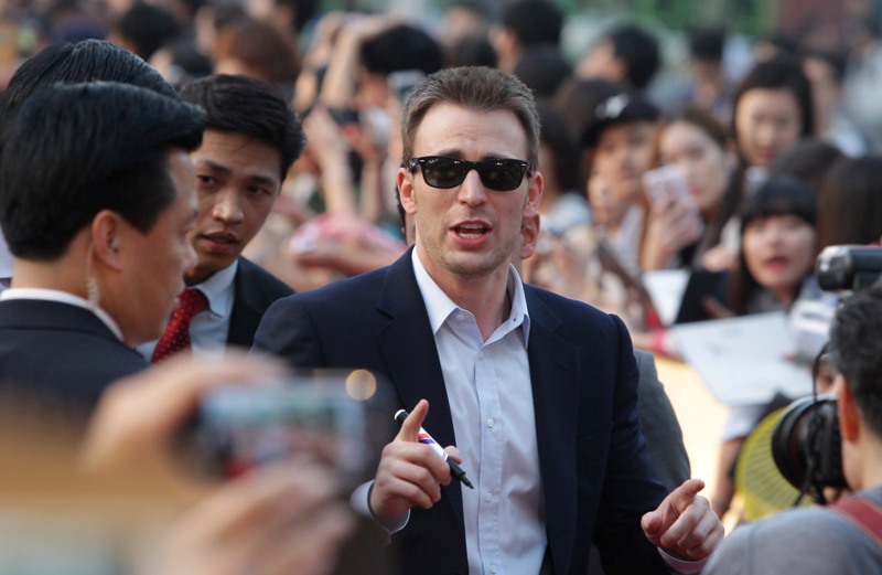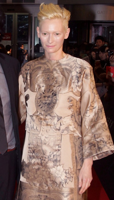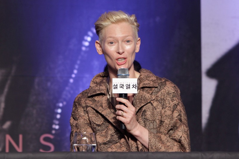 Snowpiercer doesn’t have a US release date yet (keep an eye out for it, though), but it is opening this week in South Korea, which is where the director, Bong Joon-ho, is from. Our Alien Queen, Tilda Swinton, showed up to the premiere in her pajamas. After I wrote about the trailer, reader Taina emailed about Swinton’s “formal pajama game”, and now that she’s pointed it out, all I can see when Queen Tilda goes anywhere is pajamas. She’s totally wearing pajamas! And yet, she is still Our Alien Queen, in her elegant pajamas. Chris Evans, on the other hand, showed up looking like a giant dork. Sometimes I think he’s a musical nerd stuck in the body of a high school quarterback, like he’s one second away from jazz hands.