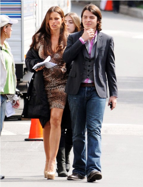 Here's Sofia Vergara on the set of Modern Family with her son Manolo. She talks about him a lot. I like the way she says his name. Mahhh-noooo-lohhhhh. And then a bawdy laugh. Almost daring you to wonder how she could possibly have a 19 year old child.